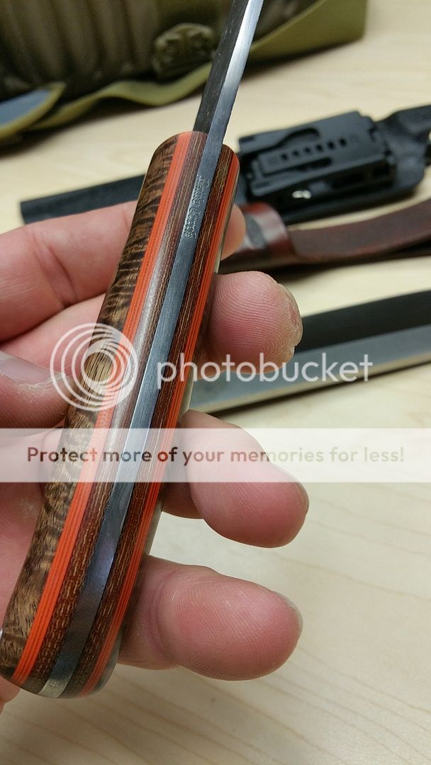 @@TRADED@@Battle Creek knives Creekster model 8 3/4 inches oal 1/8 1095 with sweet burl handles with natural micarta and orange liners comes with a nice leather tooled sheath. shipped TYD