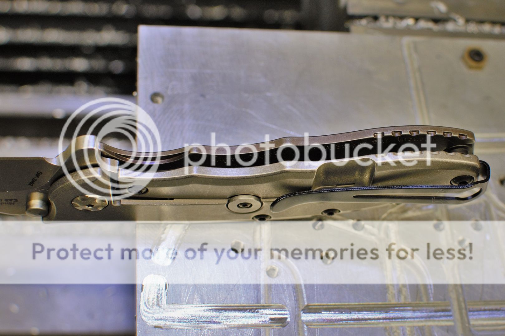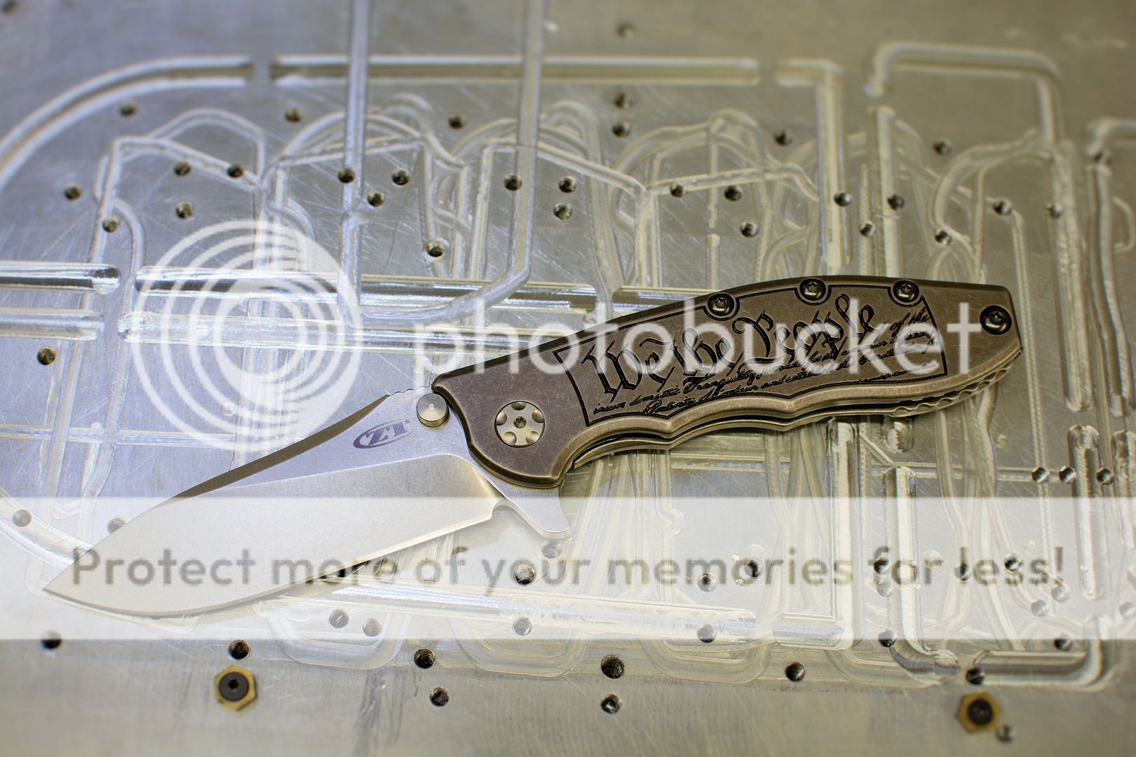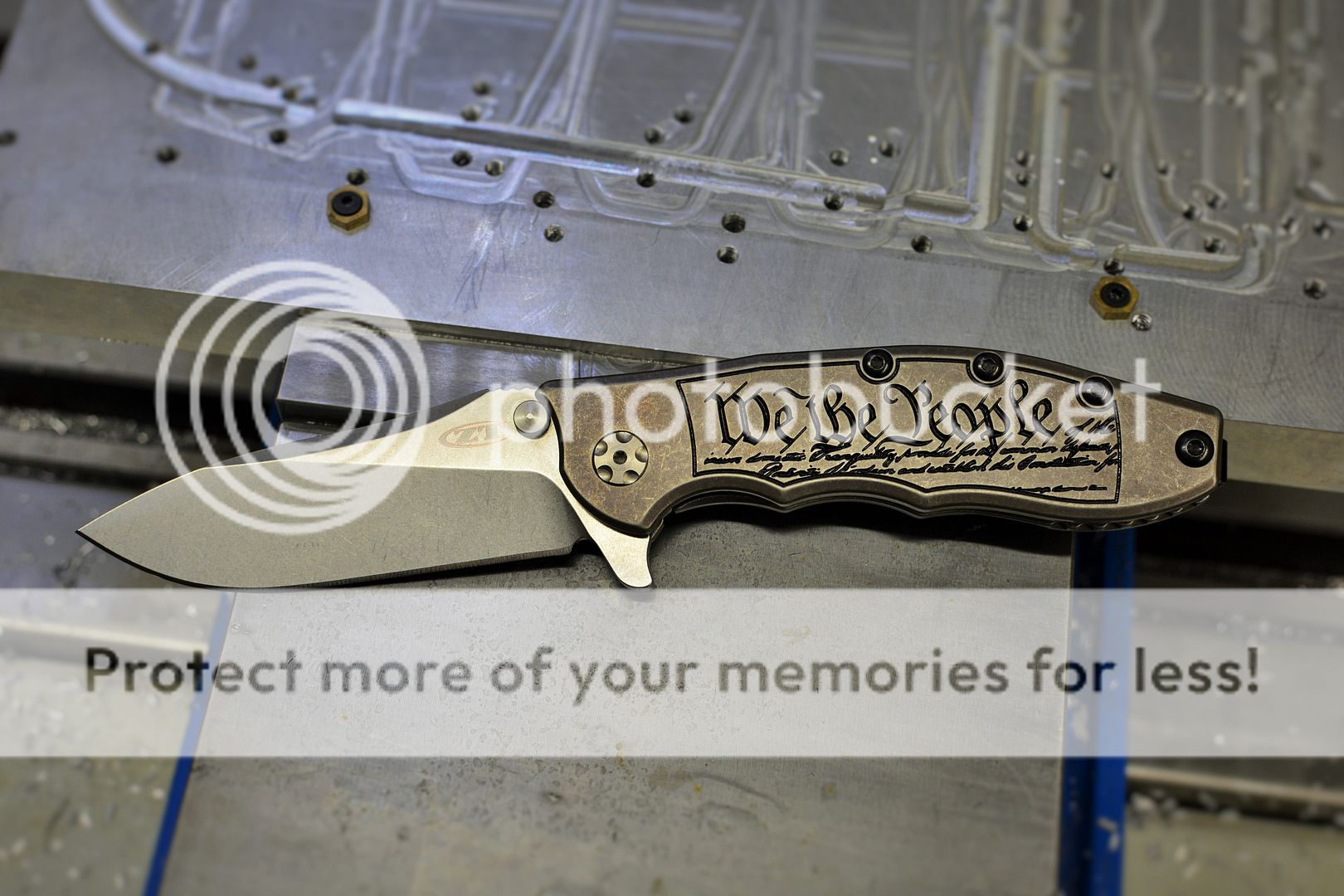 This is a new with box ZT 0562 with a whole new presentation side full thickness grade 5 Titanium scale made by me. It is a full .142" thickness and deletes the factory liner making it a full Ti knife. "We The People" theme engraved .030" and given a medium dark stonewash. Elmax blade with nice factory stonewash. Sweet flipping action and detent.