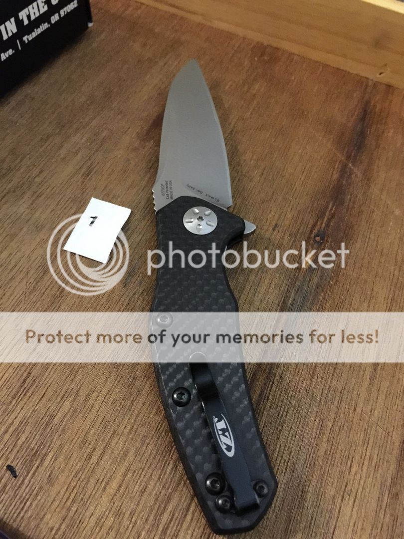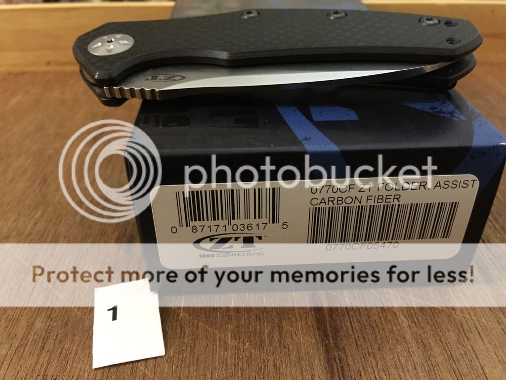 1. ***SOLD *** $99.00 TYD OBO ZT 770CF Assist Elmax Ser.# 5470 This puppy deploys hard and fast. Perfect centering, medium detent, no blade play. Has been sharpened on stones to 17 degrees inclusivesharp. Comes with box.