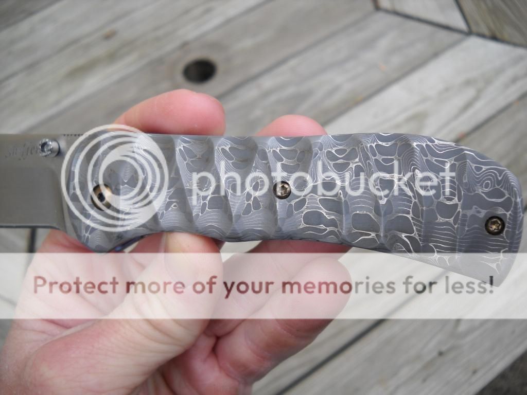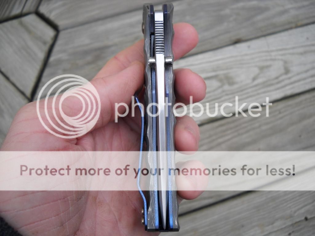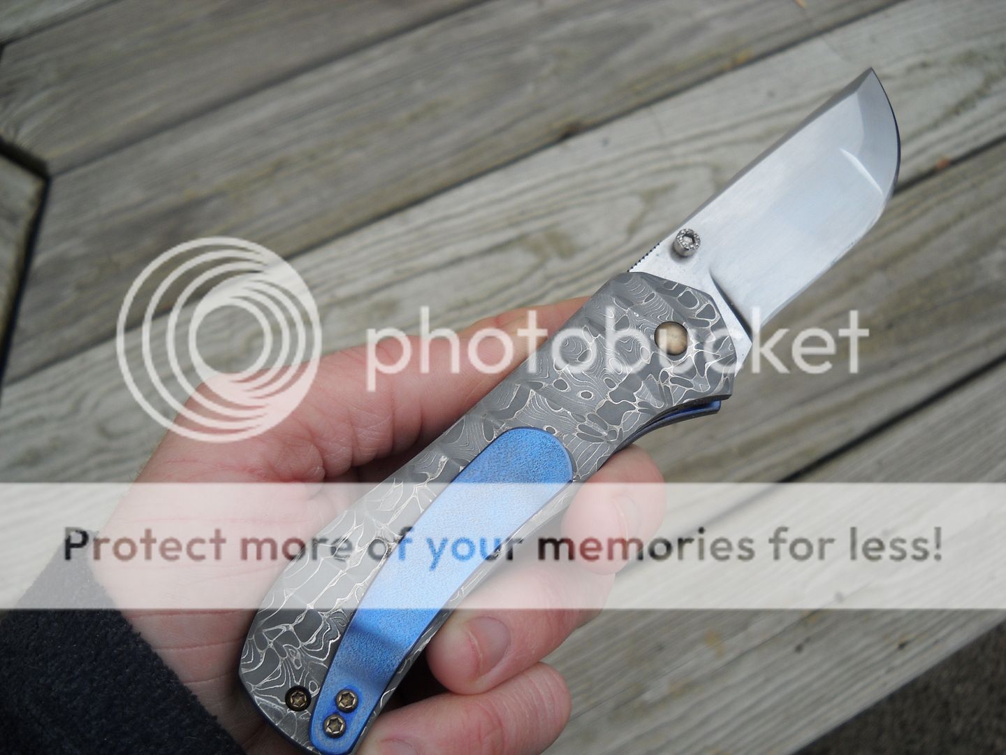 Up for sale is a 1 off 3.5" Recon folder with Whiplash Damascus scales, blue anodized Ti liners, spacer and clip.Heat colored hardware.Super smooth function and solid as all get out.Features a nice duplex grind on a Hand rub CPM 154 blade.