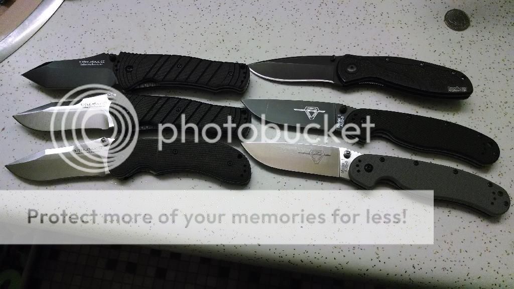 I have 3 Ontario Utilitacs, 2 RAT 1's and a Kershaw Blur. The two coffin handle Utilitacs are like new, the other Utilitac has been carried but only used lightly. Both RATs have only sat in the drawer however the the black on black one somehow got a light mark on the blade. The gray handled satin one is spotless. The Blur has been carried and used, has some scratches and nicks in the handle, and is de-assisted...but still has great lock up and no blade play.