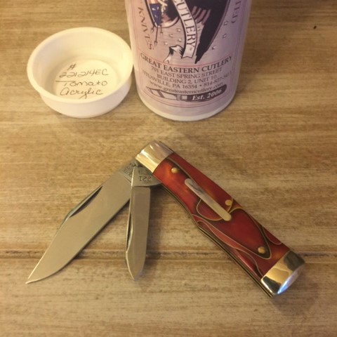 JohnDF Feedback: +46 / =0 / -0 Joined May 14, 2018 Messages 28,969 Sep 24, 2018 #1 For Sale: GEC #22 Magnum First "I'll take it" with prompt message and payment will receive. Price includes PayPal fees and shipping to US Cont Lower 48 (only). GEC #221214 in Tomato Acrylic This little knife is a "user" but still in excellent shape, priced accordingly... $120.00