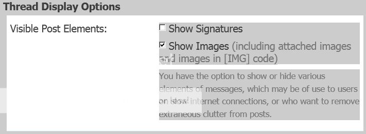 You have the option to show or hide various elements of messages, which may be of use to users on slow internet connections, or who want to remove extraneous clutter from posts.