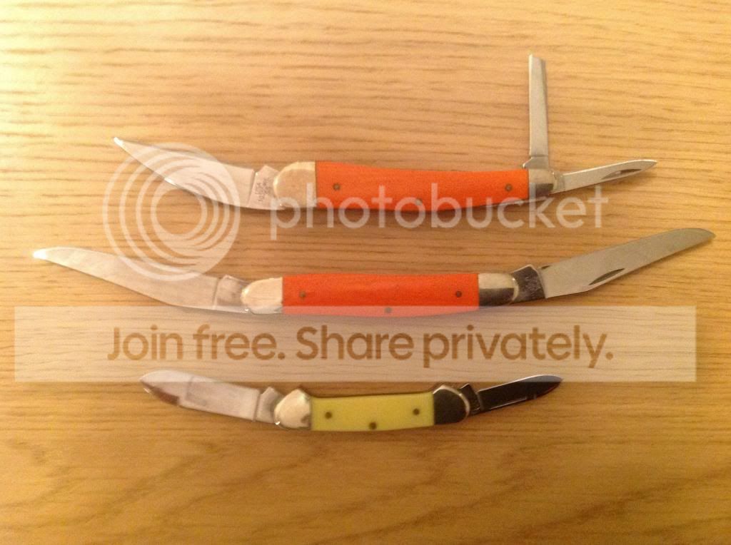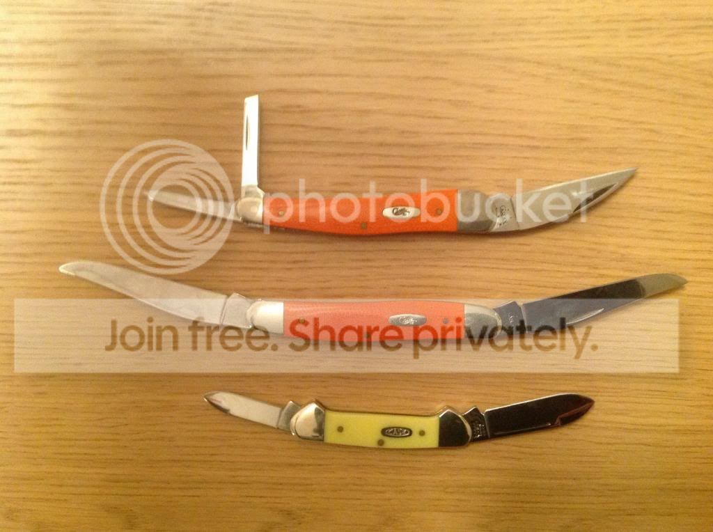 I have some nice discontinued Case folders up for grabs. First is an orange G10 Seahorse. This one has been carried and used with some fine scratches on the main blade from opening and closing. Otherwise it is a very clean piece,with nice walk and talk. No box for this one.
