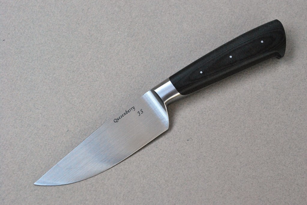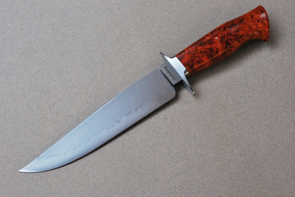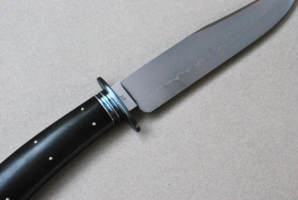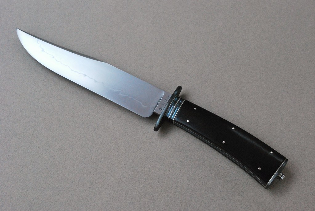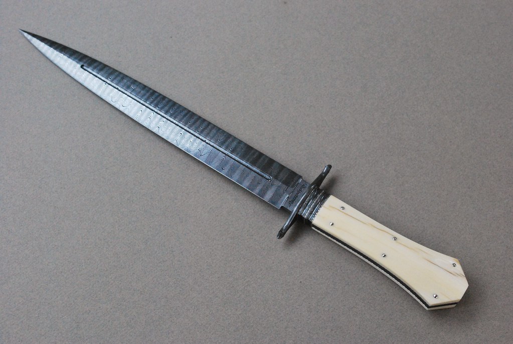 These are some of the knives that I had at the show. The first is the dagger that won Best in Show. It's one of those 11" coffin handled daggers with fossilized walrus and damascus fittings. The second is a W-2 bowie with nitre blued fittings and full takedown design. The third is a W2 fighter with 416 guard and shaped Amboyna handle. The last one is a little full tang integral hunter in W2 with micarta scales. Hope you like em'.