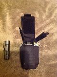 The Skinth L-shield is a perfect size for a Leatherman Charge type multitool (Main pocket) and can hold up to 2 AAA sized flashlights on both side pockets.