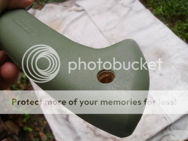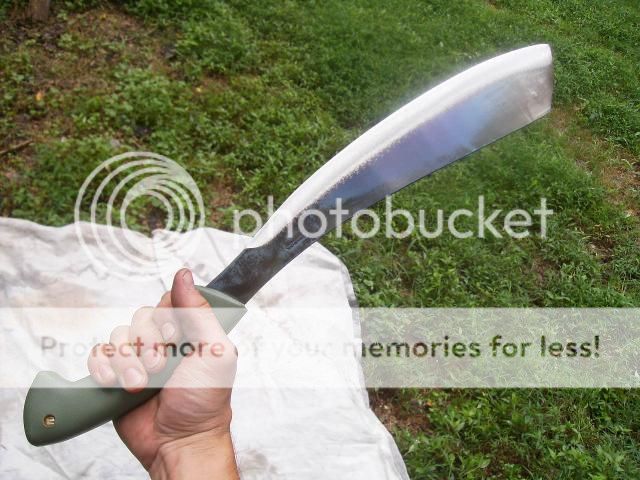 some inhand pics to start. The handle is filling. I wear a medium/large glove and found the handle to be very comfy to grip. If in time i find the handle to be to big i can easily shave that polyplastic stuff down and make it easier to grip. I did this on both my condor bolo machetes (12 and 15) and they are great now. The handle has a bit of texture to it, not perfectly smooth but not rough to handle either. If you find it to slick it is no problem to rough it up a little with some sandpaper.