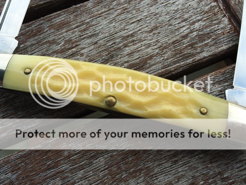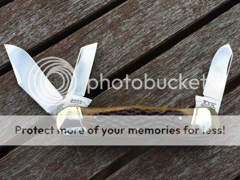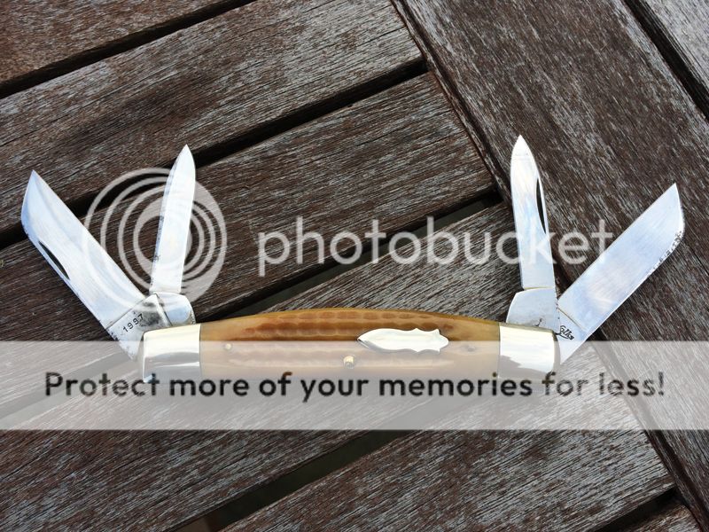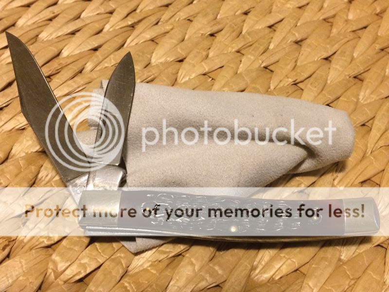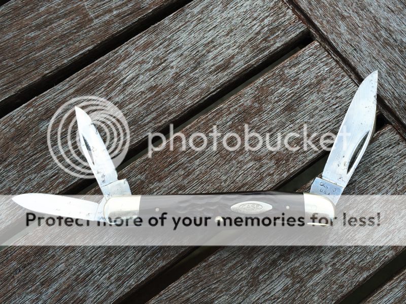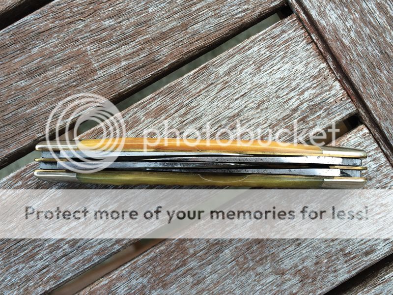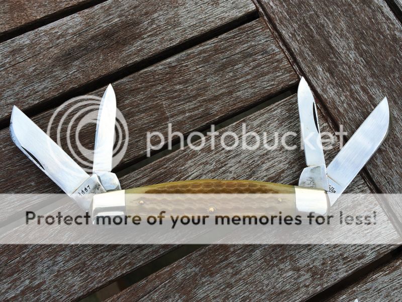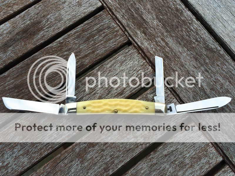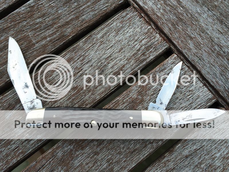 This one has been used, carried, and sharpened but could make an excellent edc. The jigged brownbone covers are in great shape with no chips or cracks and the two secondary blades still have excellent snap. The main blade is lazy, due to the springs being set a little low, and there are some spider veins on all blades. I think this one would make a great fixer-upper and still has tons of life left in it!