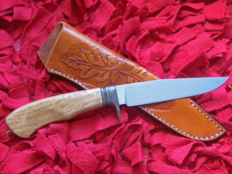 About five years ago, just a little way into my knifemaking journey, I was in a stage where I was scrounging materials from all over. One of the things I came home with was a drag harrow tooth from my great-grandfather's farm near Spicewood, TX. It was too large for the capability of my forge at the time, so it sat on my workbench waiting on a "round tuit." Last July, I built a forge that could handle it. Last November, at a Big Country Knife Club hammer in, I finally forged the blade. Now that we're into March, I finally have the blade finished out. I figured with the rustic background of the steel, I should go with a complete rustic theme, and since it was family steel, I'd use family wood. We had our hardwood floors in our house refinished in January, and this material is some of the red oak floor boards. They were stamped on the backs as harvested in 1955 and milled in Gilmer, TX. A wrought iron guard, fluted ferrule, and fileworked finial finish out the package. This knife was built takedown, but is now glued. The right hand sheath is tooled with an oak leaf theme, to match the traditional "vibe" and the handle material. The steel is unknown, but tests at RC 59. The knife has a 600 grit hand finish and a convexed edge grind. Oal is 10 1/2" with a 5 3/8" blade. The blade is about 1/8" thick at the ricasso, with distal taper. I was really hoping I could put this one in the hands of Fisk and Rhea at a get together we were having, but it got rained out. As it turns out, the event host bought the knife, so they'll get to see it anyhow