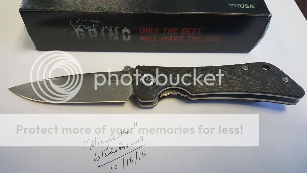 I've got my eye on something else, so my Southern Grind Spider Monkey is up for sale today. Carbon fiber, stonewash, drop point, plain edge version. It's in excellent overall condition -- I carried once or twice but cut nothing more than paper. Shaving sharp, free dropper, tight lockup, and locks up early at roughly 35% or so. It's a nice example. Box, cards, etc. included. Pics taken yesterday, please see below.