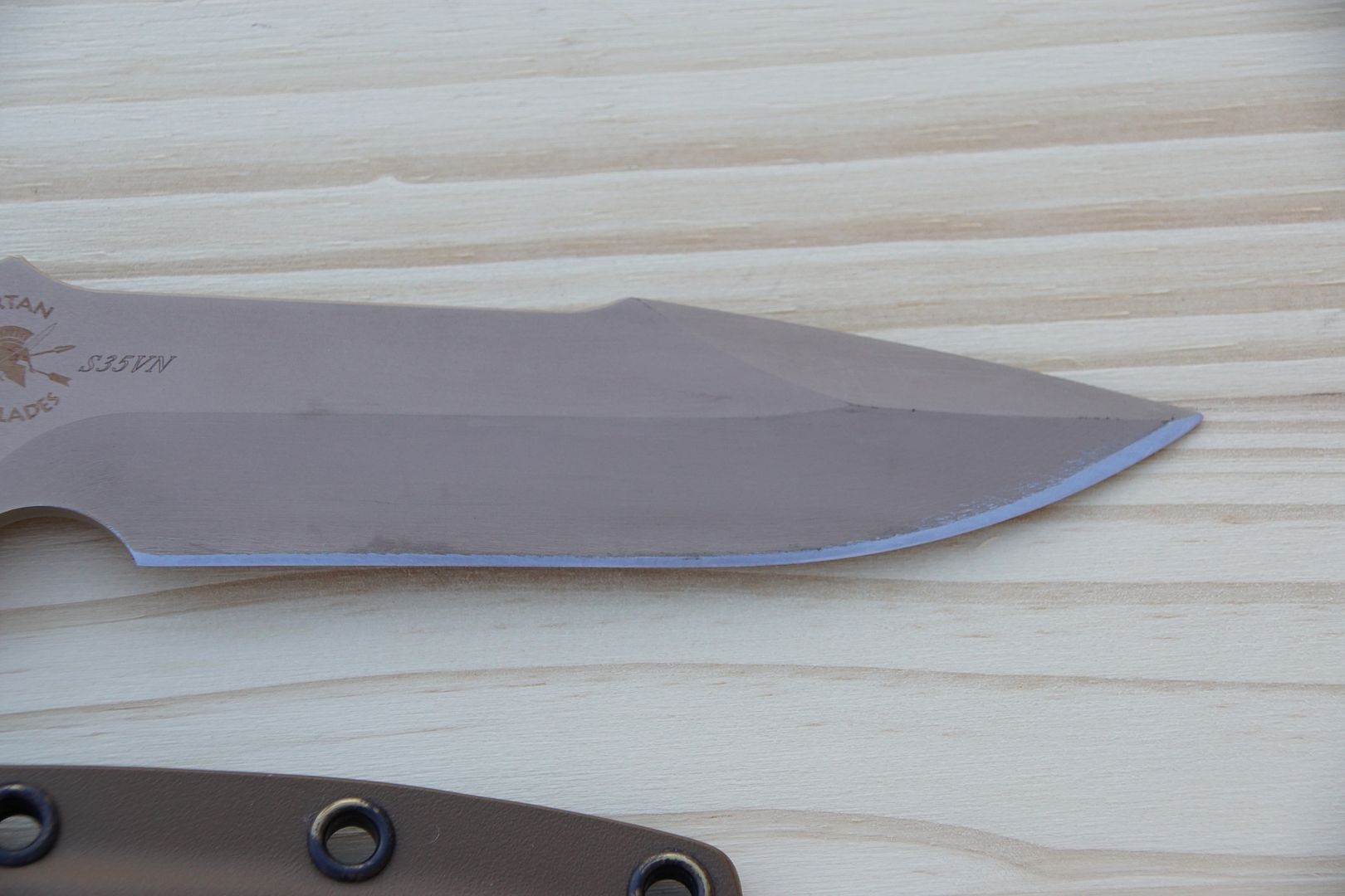 Blade Style: Drop Point - single edge design with relieved distal spine and tapered drop for tip strength.