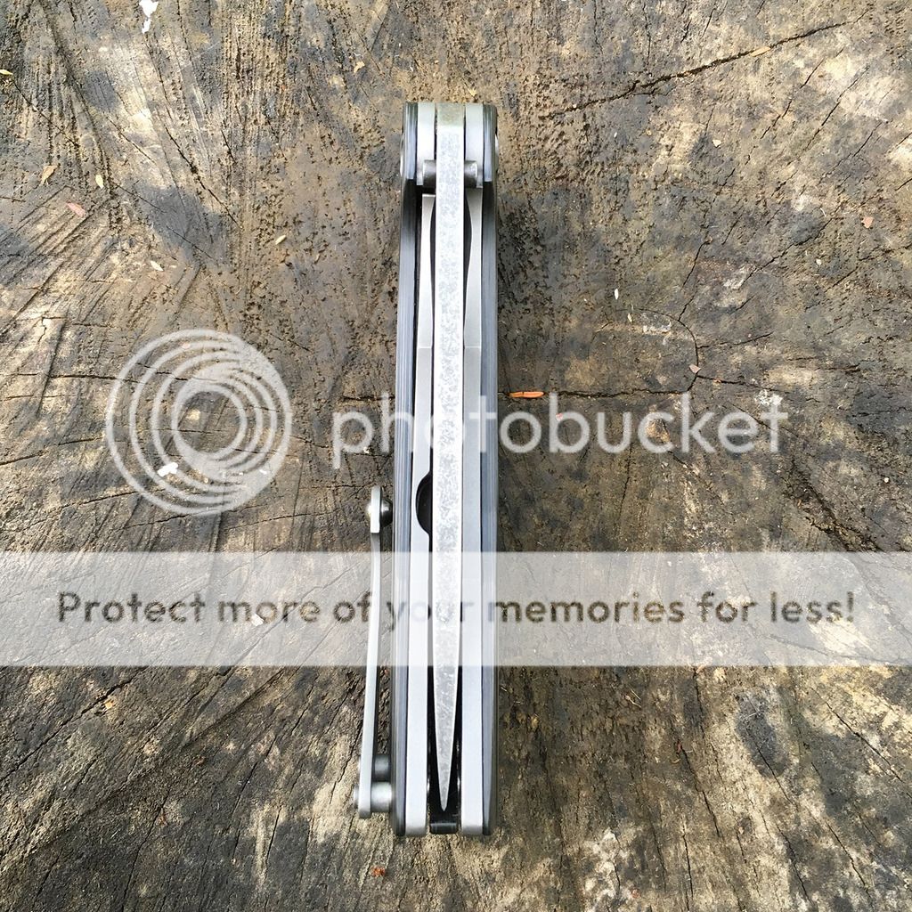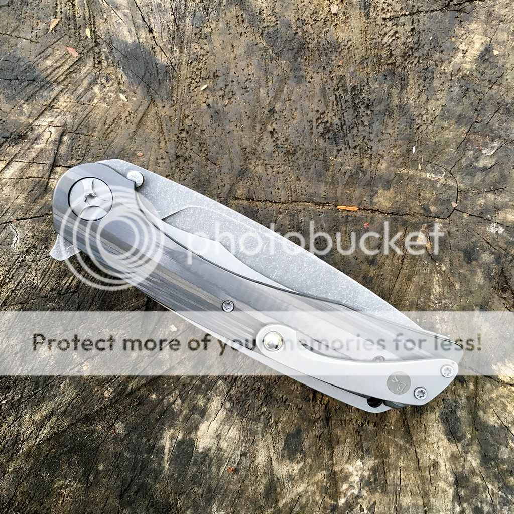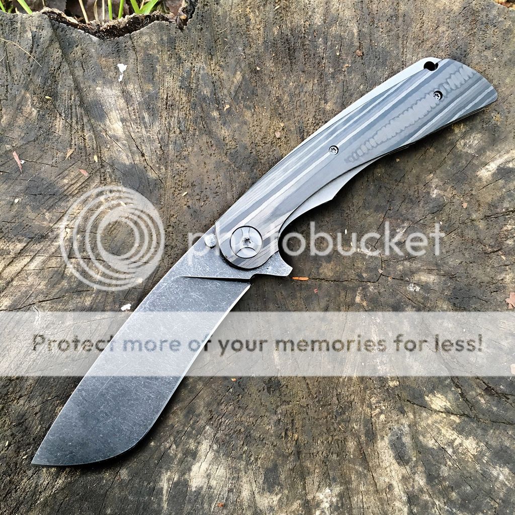 Black Snow Sabotage No. 22 with unidirectional carbon fiber scales and black washed D2 blade. Absolutely perfect and this is the newest improved version with the external stop pins. Blade is centered with no play in any direction. This knife has no issues whatsoever. Has been carried a couple of times but not used. Buttery smooth action and blade easily falls closed under it's own weight with no wiggling. Comes with plastic case as when purchased direct.