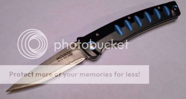 Excellent condition blue Mcusta Katana with VG-10 blade. Knife has never been carried and there are no scratches or handling marks. Comes with original box.