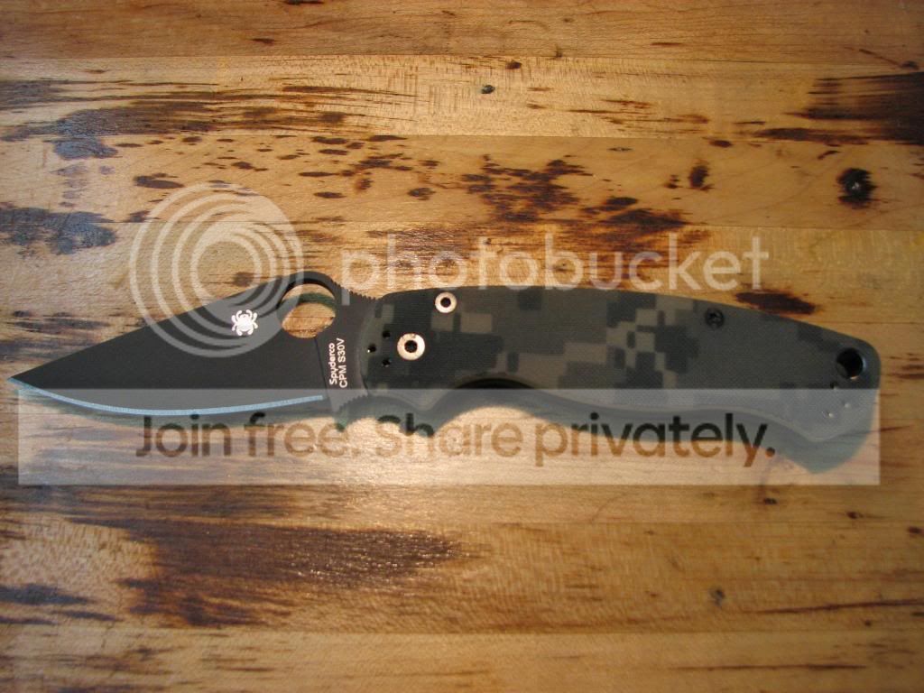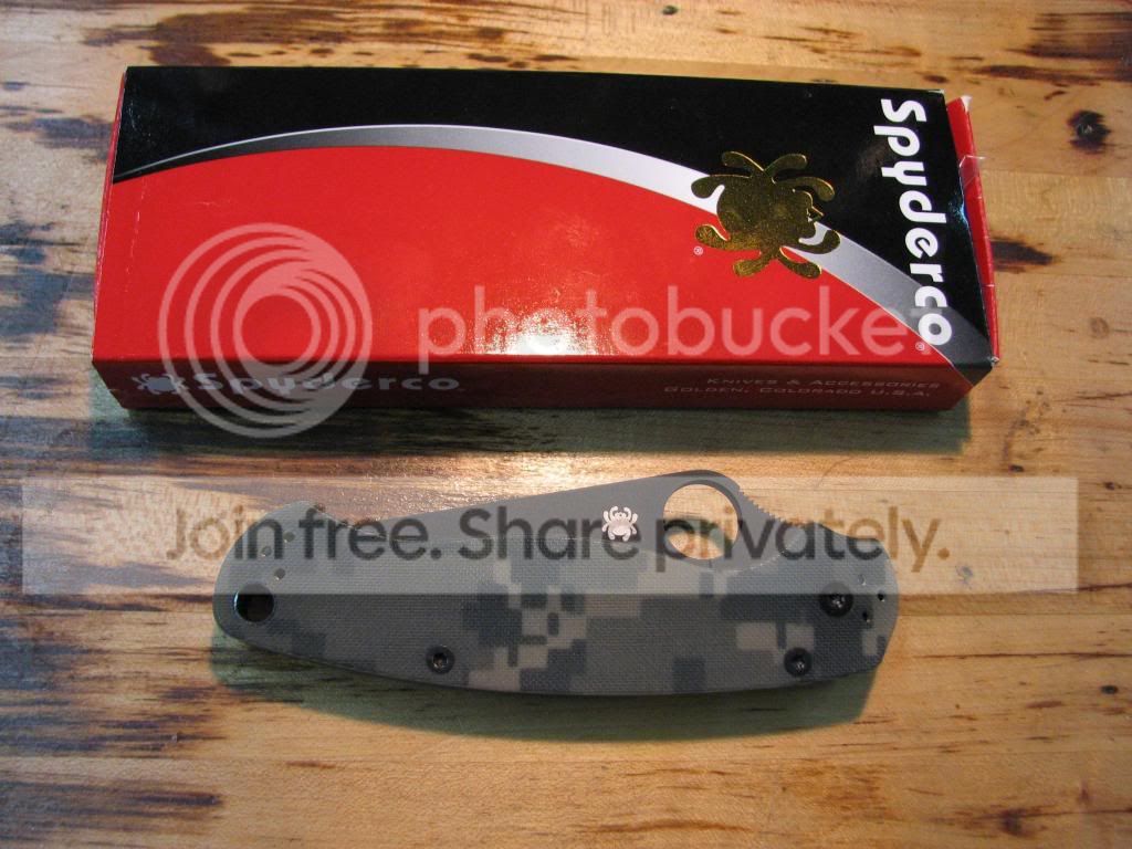 I have a new in box Spyderco PM2 with Digi-Cam scales and black DLC coated blade. This PM2 has dark Digi-Cam scales that really look great along with the DLC blade as you can see from the pictures. It has never been used or carried. Edge is still factory sharp, has not even cut paper. I switched the clip from tip-down to tip-up carry, right hand and clipped it onto my pocket. It carried larger than my Contego (unbelievable I know) which really made it hard for me to slide my hand in and out of my pocket to retrieve my keys, so I decided that I had to let it go, so it truly is a catch and release. I had it on back order for a long time and when it finally came in, I was disappointed by how it carried. I've opened and closed it a few times just to get a feel for how the compression lock works since it's my first. The blade opens smoothly via the thumbhole, but needs a little flick of the wrist to get it closed. I am assuming that as a new knife, it needs a little break-in as most do. The knife locks up solid and early and as the pictures will attest, the blade is perfectly centered.