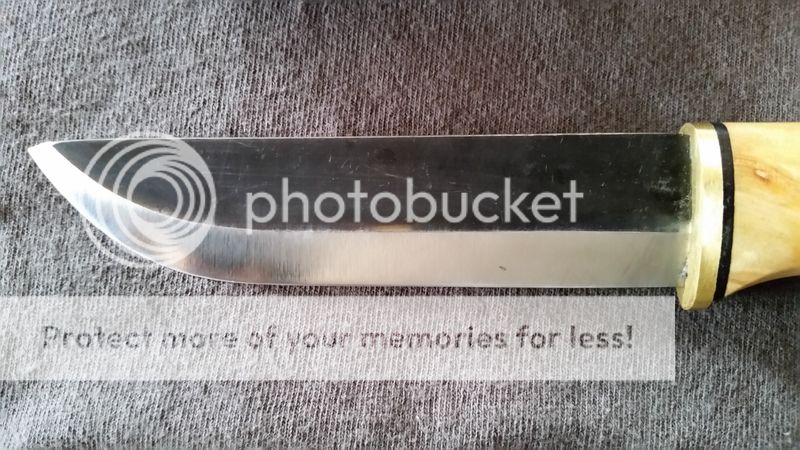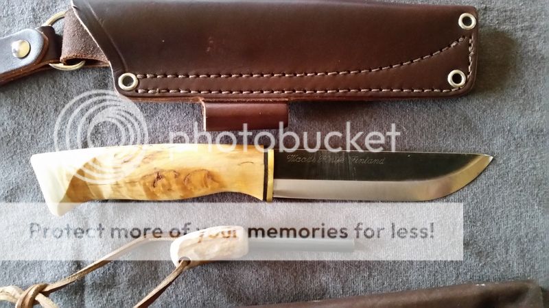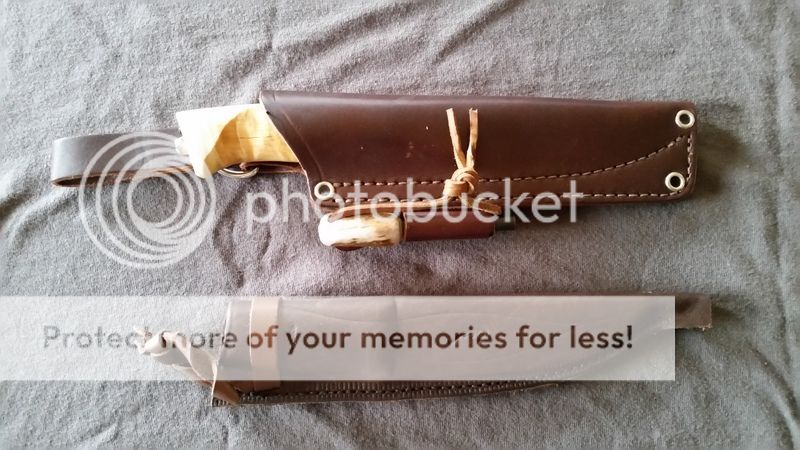 [/URL]Next up is a Woodsknife Forest (Finnish manufacture) I picked up a while ago, used a little, but never got in the habit of carrying. Has carved a little, had a firesteel struck on it's spine, and that's about it. Some wear on the blade as a result, you can see it well in the photos. I'm including the original, traditional sheath, plus a JRE sheath I've had hanging around. And, I'm also including an antler-handled firesteel, never used, to make a very nice package. Here's the vital statistics on this knife: