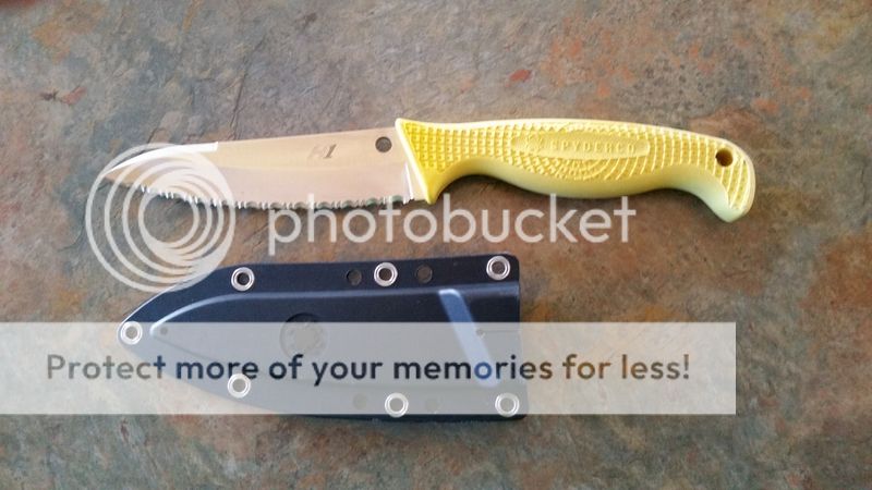 Spyderco Aqua Salt, serrated edge, H1 steel. Yellow handle. Discontinued model; the Aqua Salt only comes in black handle and blade anymore. 2nd owner, has ridden on my PFD only, I don't believe I've ever used it. Some light scratches on the blade from the sheath, I think I got a pretty good shot of them in the second photo. No G-clip with this one, previous owner kept it. SPF.