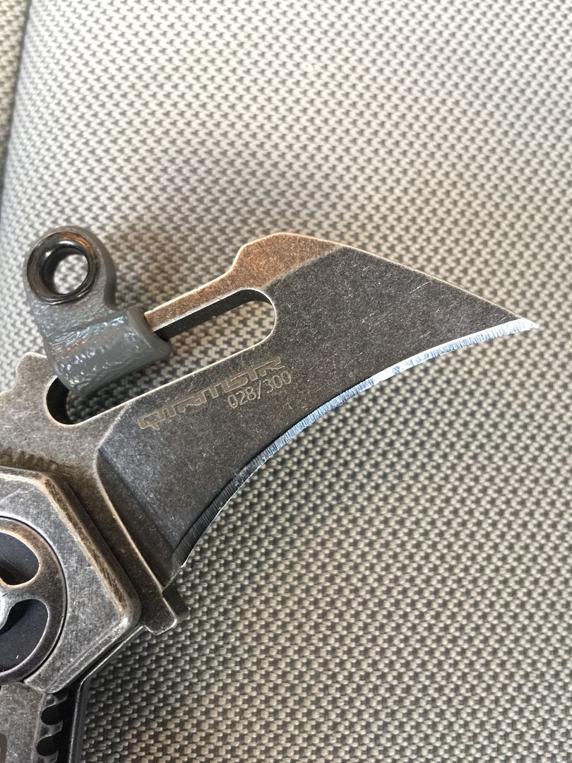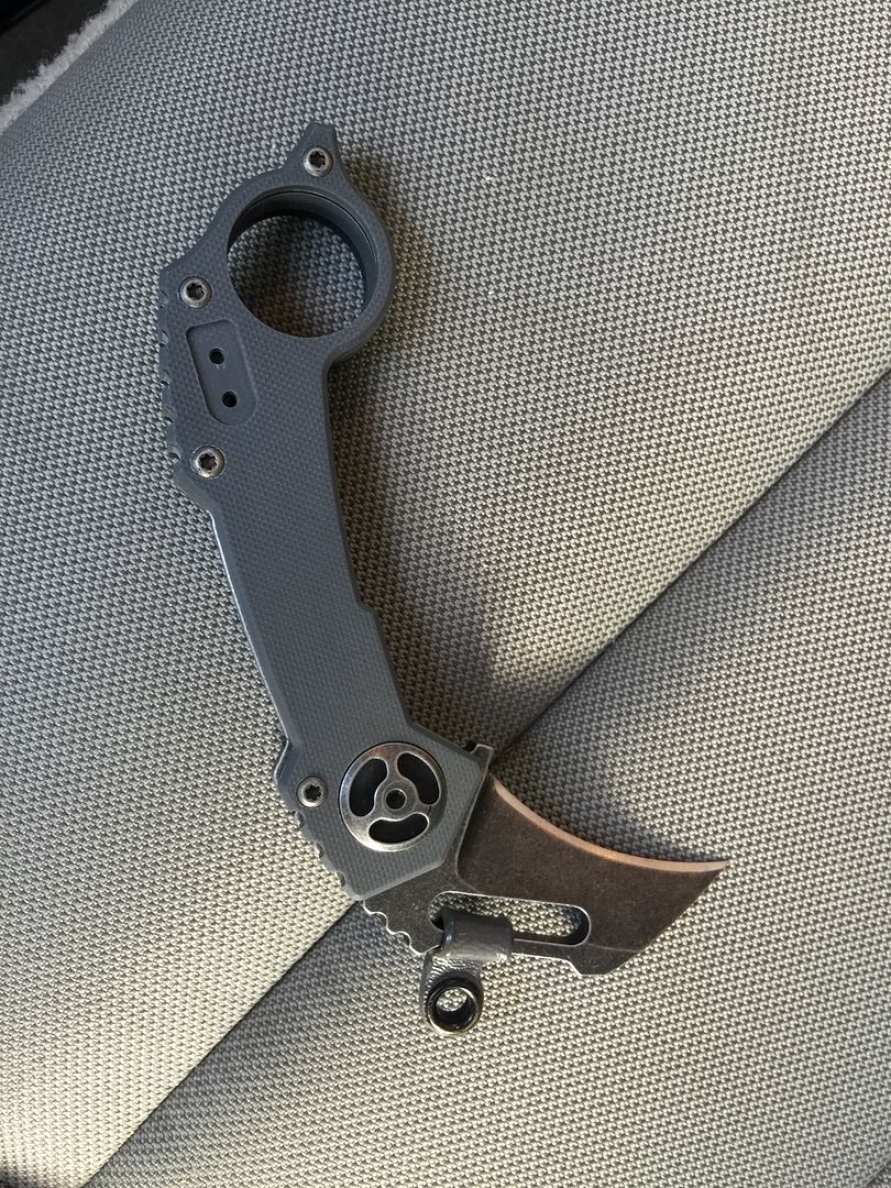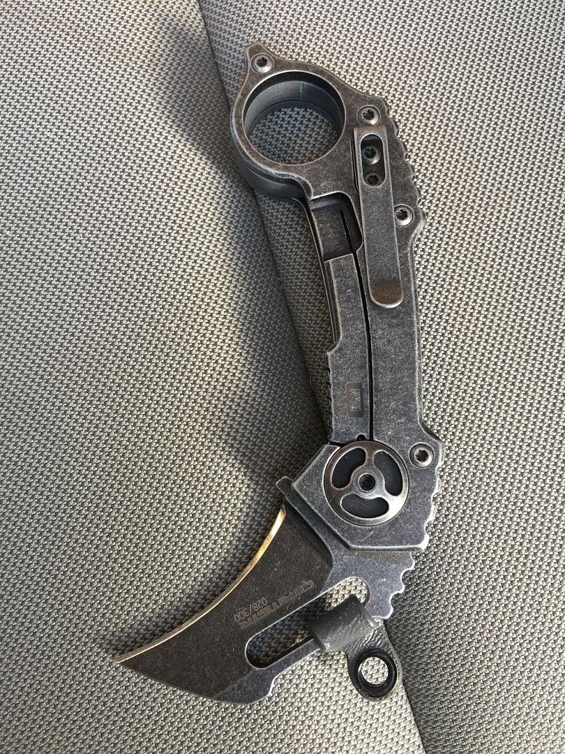 QTRMSTR karambit, I think its the QTR-5 or something along those lines. "Texas Tea" finish with gray G-10 scale. Extremely smooth action, blade drops free, zero play. I added a kydex wave to the blade to help it wave open. It waves EXTREMELY positively now. I can permanently remove this upon request. Unused condition, LNIB, I may have the box, not sure. Asking $150 shipped. SPF