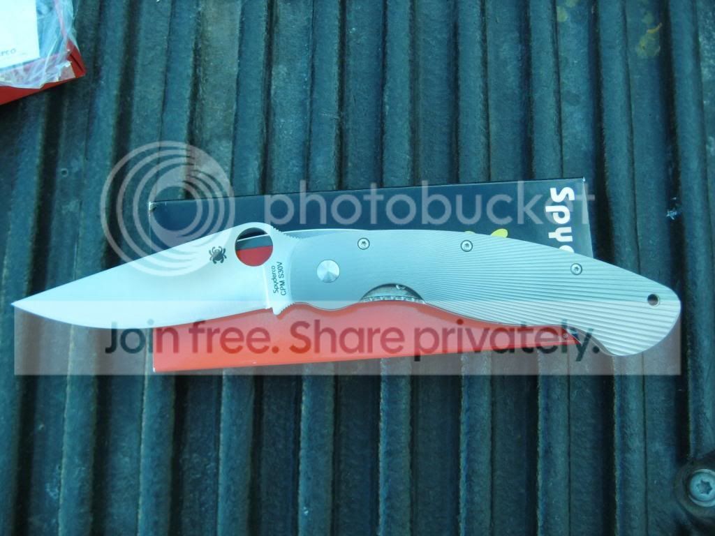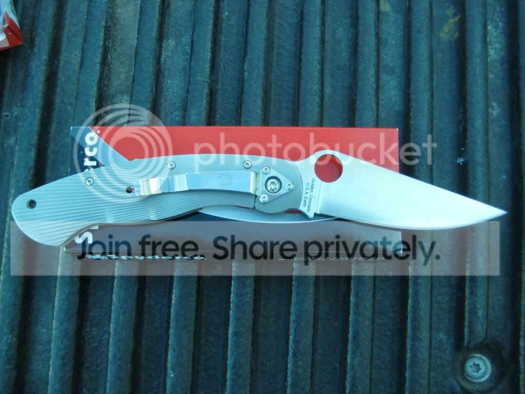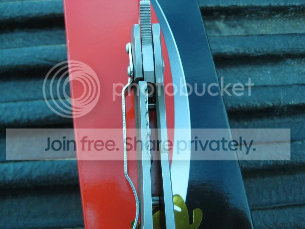 Fluted Ti military as received from Knifecenter earlier this week, knife has been opened a total of 3 times, no use of any kind other than that, LNIB I would call it. Box has one dinged corner seen in the first picture. This is the first fluted millie I have seen that has NO anodizing on the handle, it's natural Titanium. Smooth opening, early lock up and blade is well centered.