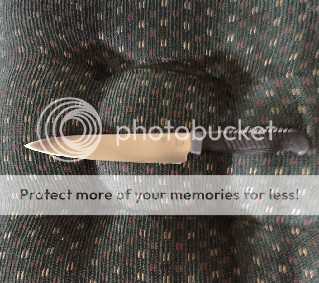 Up first, a nice normally used, Spyderco K04 plain edge 6.5" kitchen knife. It has seen use, been sharpened, cleaned etc. I'll be danged if I can find the box, sorry.