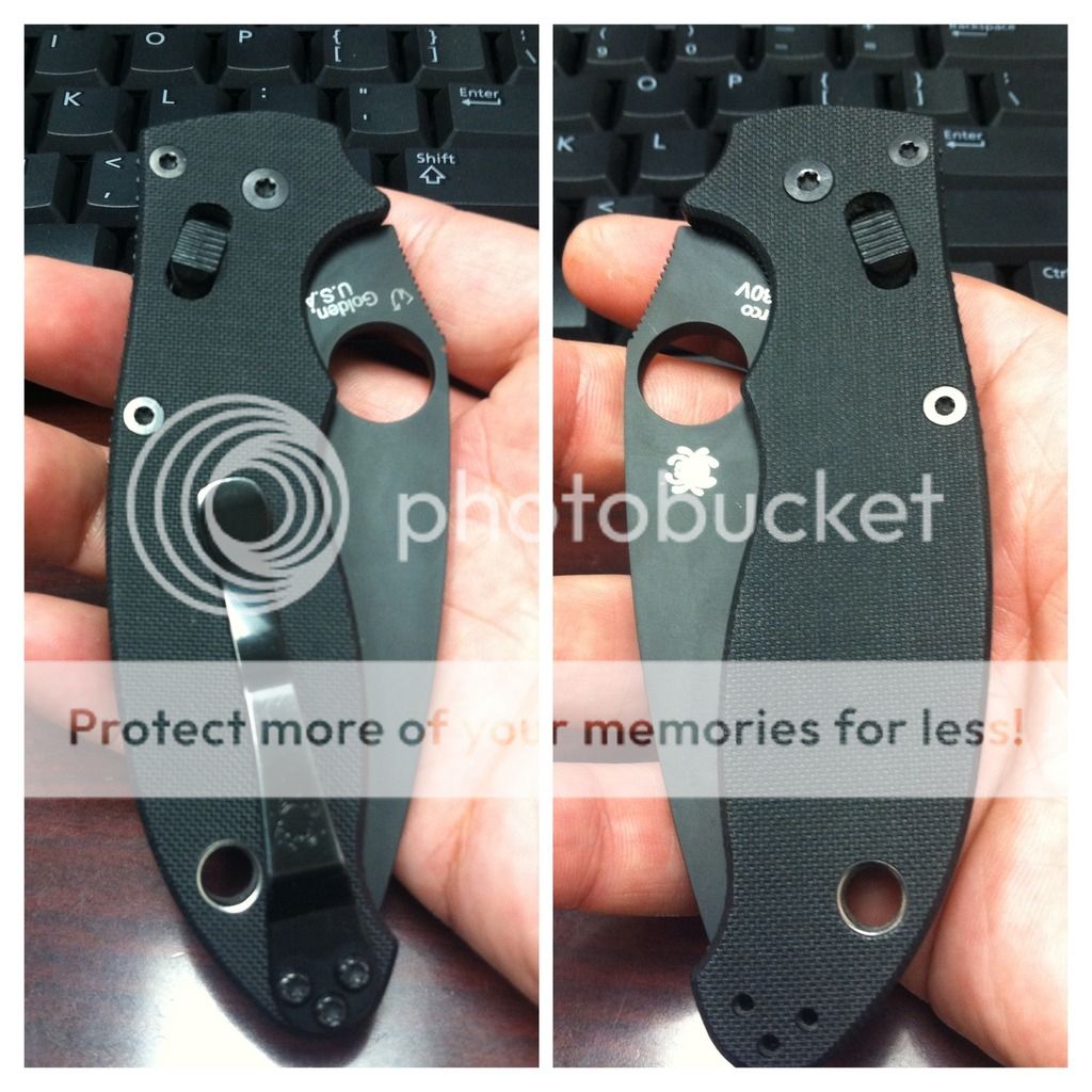 What we have here is my user Spyderco Manix 2. This is the blacked out version with the full flat ground blade of S30V. It's a factory second, and is marked with a small grinding notch. Pocket clip shows some wear, and the blade has some scratches but is still factory sharp.