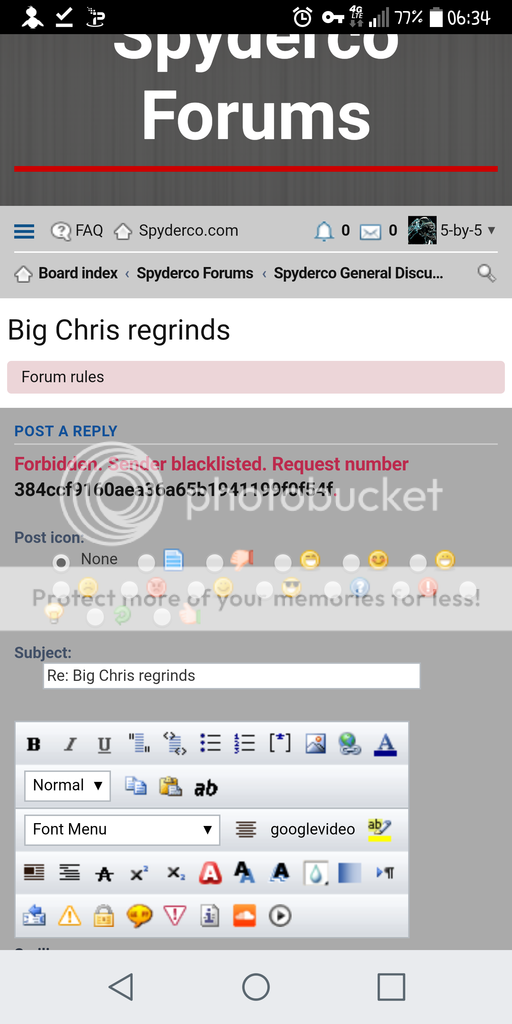 Anyone getting this message when attempting to post or reply to a thread in the official Spyderco forums? Never had a problem until today. Perhaps they increased the aggressiveness of their SPAM filter...