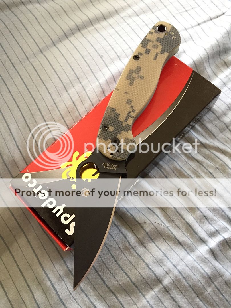 Spyderco Paramilitary 2 with Camo scales and DLC coated blade. Has been carried once or twice and only used to cut tape open on a few boxes. Clip has been flipped to tip up, knife has NOT been disassembled. Blade is centered, no blade play, factory edge. In excellent/like new condition. Comes with box and paperwork.