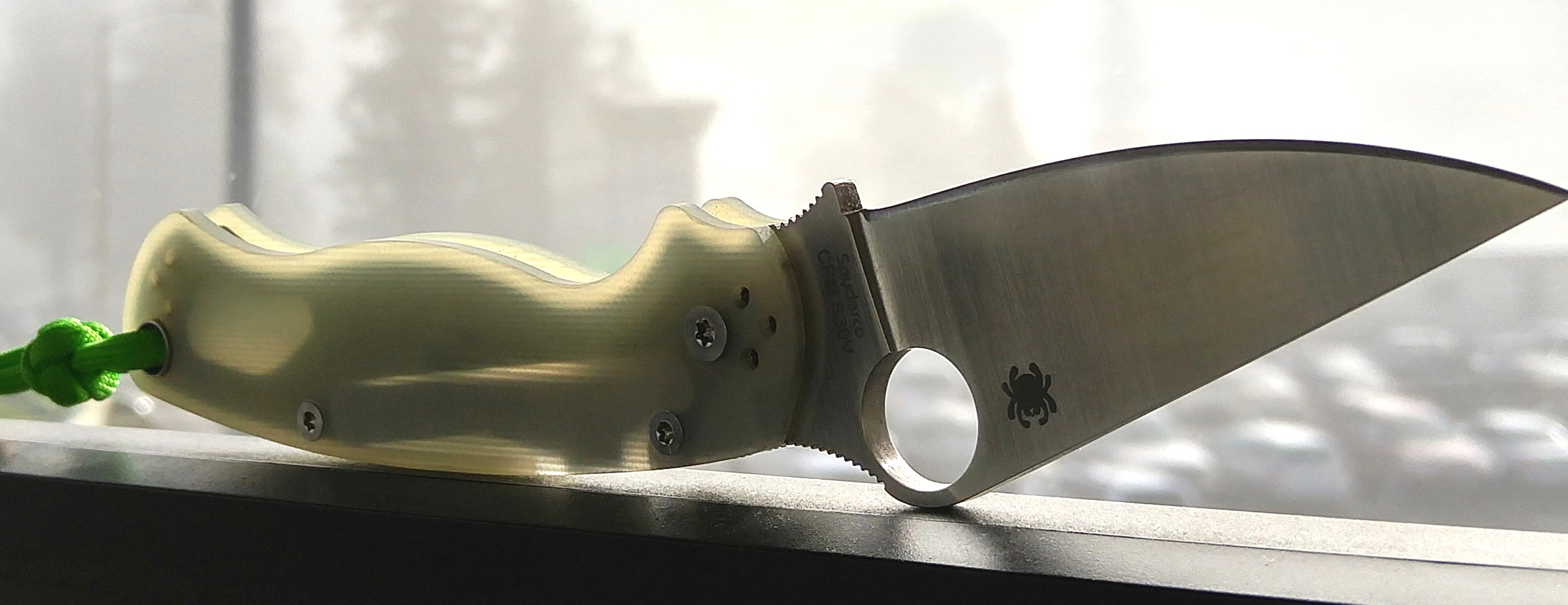 FS Paramilitary 2 with camo G10 modded down to natural jade. This is a S30V model. All screws counter sunk. Except the lanyard tube. It protrudes about half a millimeter. Barely noticeable in hand. Not a perfect mod but looks good. Box has puppy love marks.