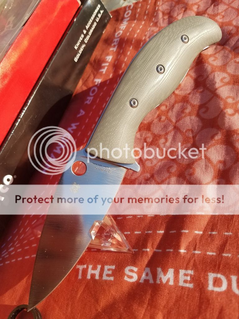 Excellent condition Spydero Phil Wilson Southfork - $190 - $old shipped CONUS. Original Owner, used a number of times in the kitchen. Blade is in excellent shape overall. The original factory edge has never been sharpened and is still quite sharp. Sheath has excellent retention. I don't believe I have the box but if that is a deal breaker I may be able to find it. Excuse the smudges in the photos.