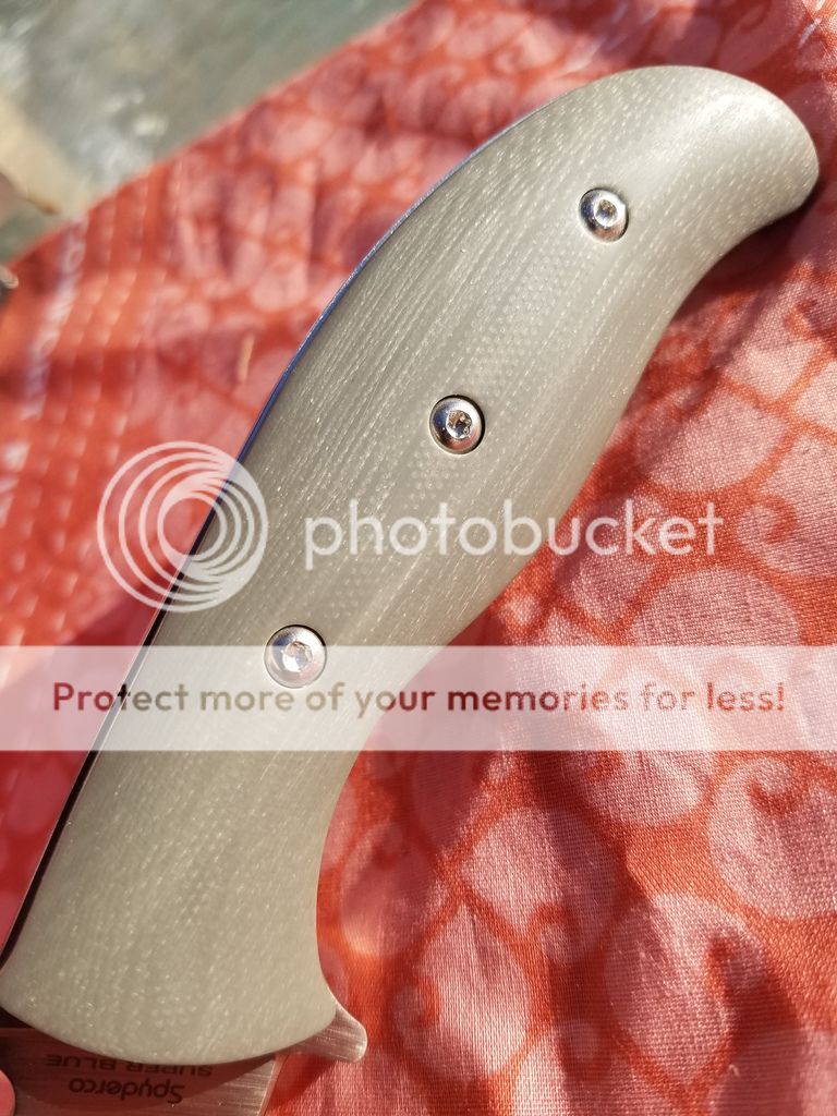 Brand New / Excellent condition Spydero Mule Team 08 Superblue - $old shipped CONUS. Second owner, knife has never been used. Previous owner put some sanded grey g10 handles from Halpern on the knife. They are not glued on. Knife has been stored in the rust proof paper, oiled, and no patina or darkening can be found on the blade, nice and shiny! There is a very light and very small scratch on the right side of the blade. Comes with box and all originals.