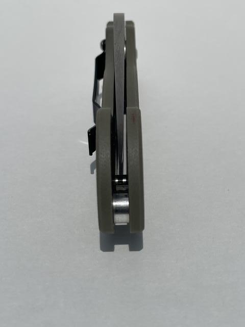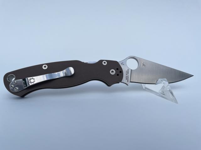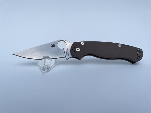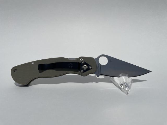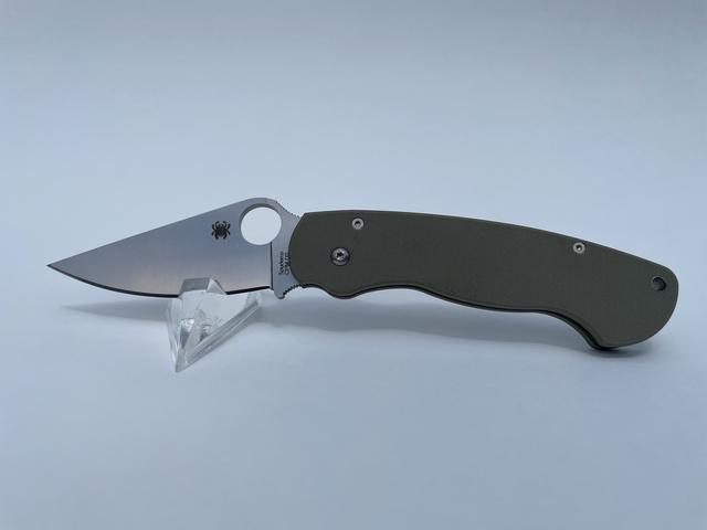 1) Spyderco Paramilitary, D2 steel, foliage green scales, black clip, satin blade. SOLD .