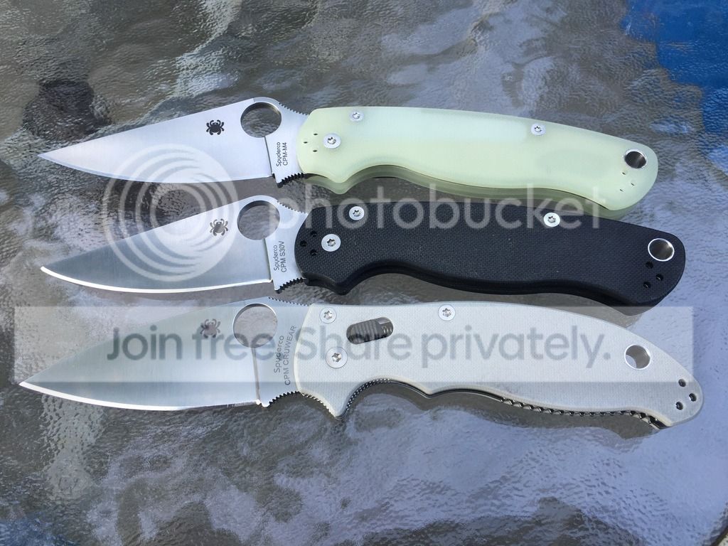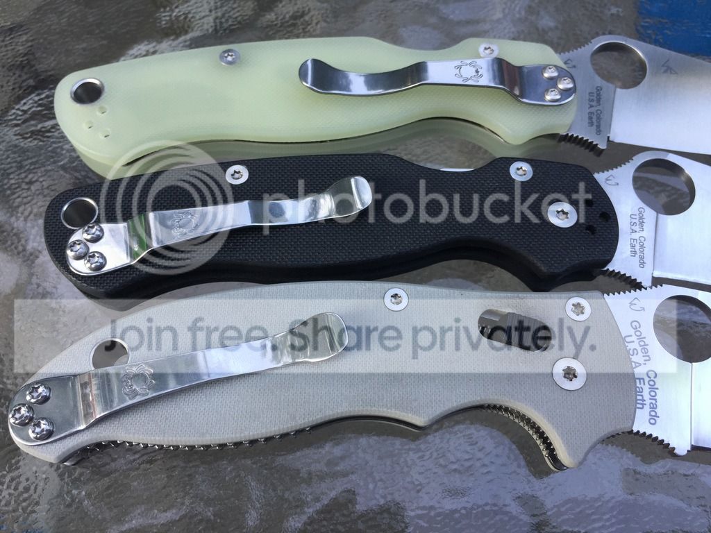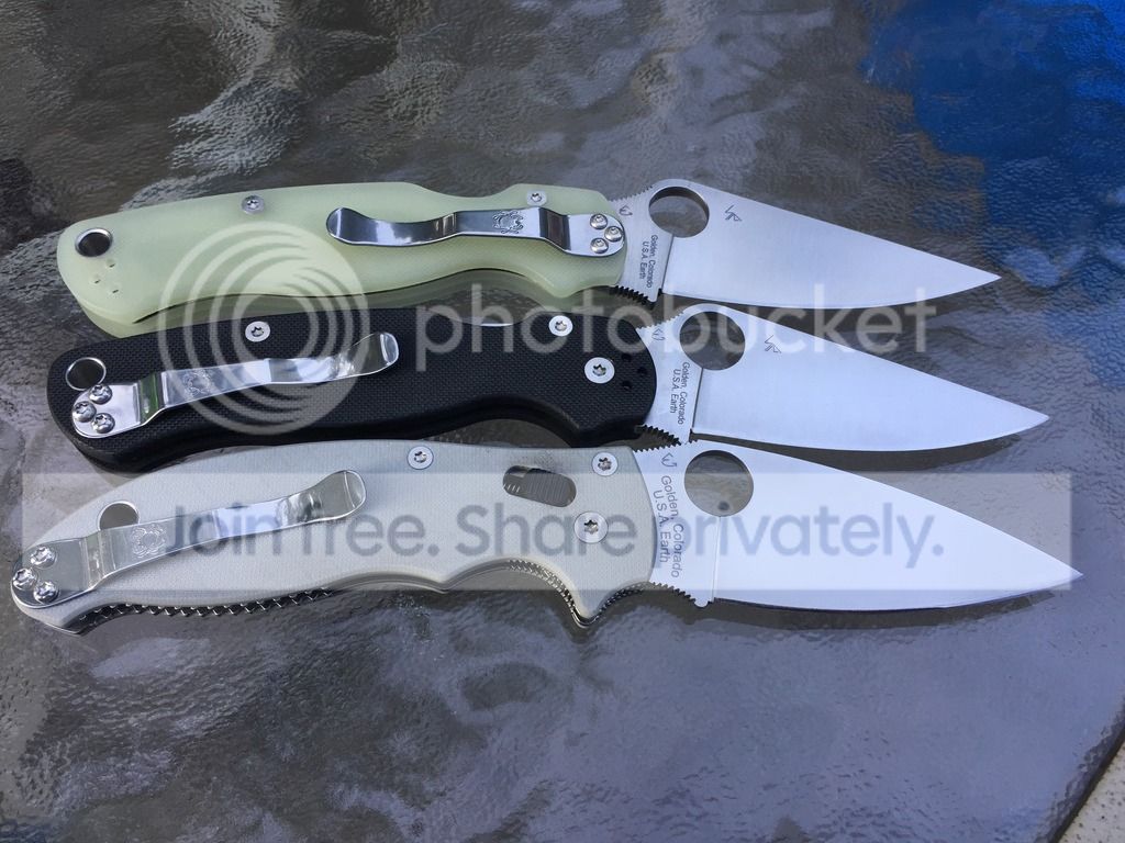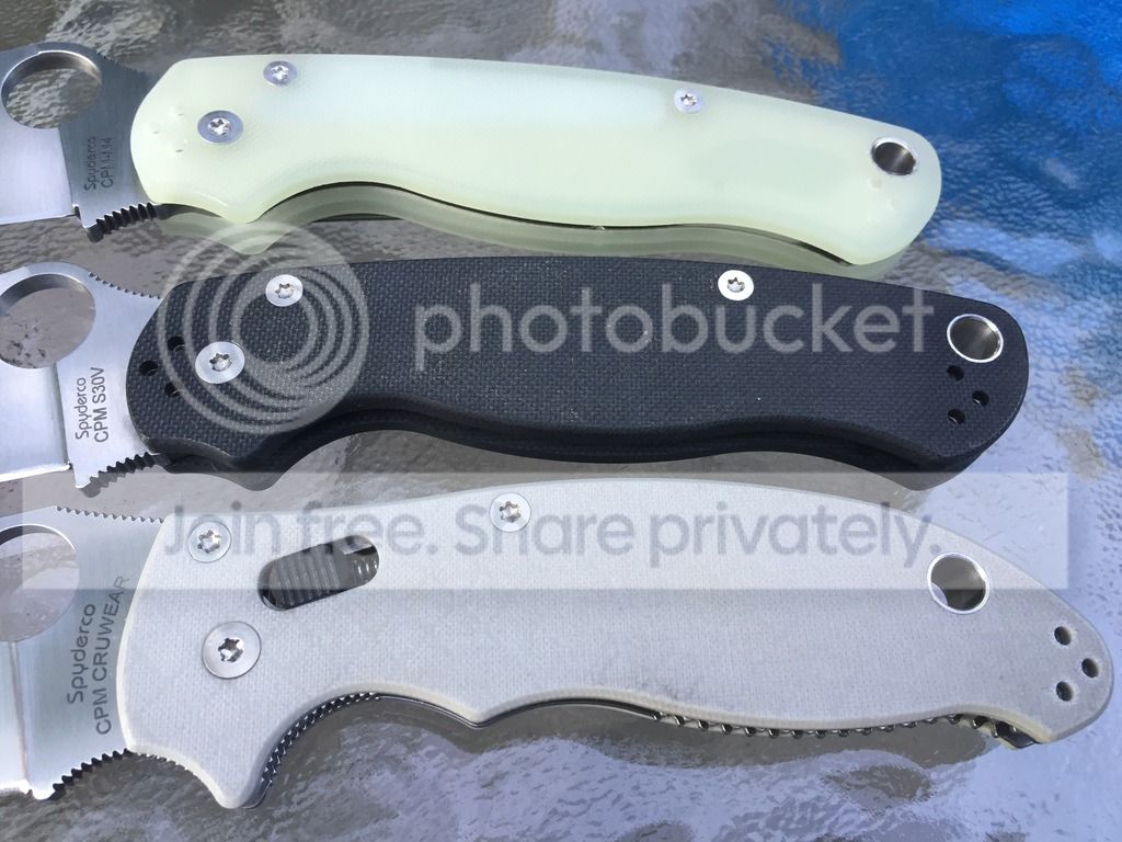 Spyderco Pm2 S30V Black/Satin. Well used, sharpened lots, scratched lots, clip screws changed to Manix clip screws. Tip isn't as pointy as it once was.This was a long time user but lots of life left. Dead centered, box included. SOLD