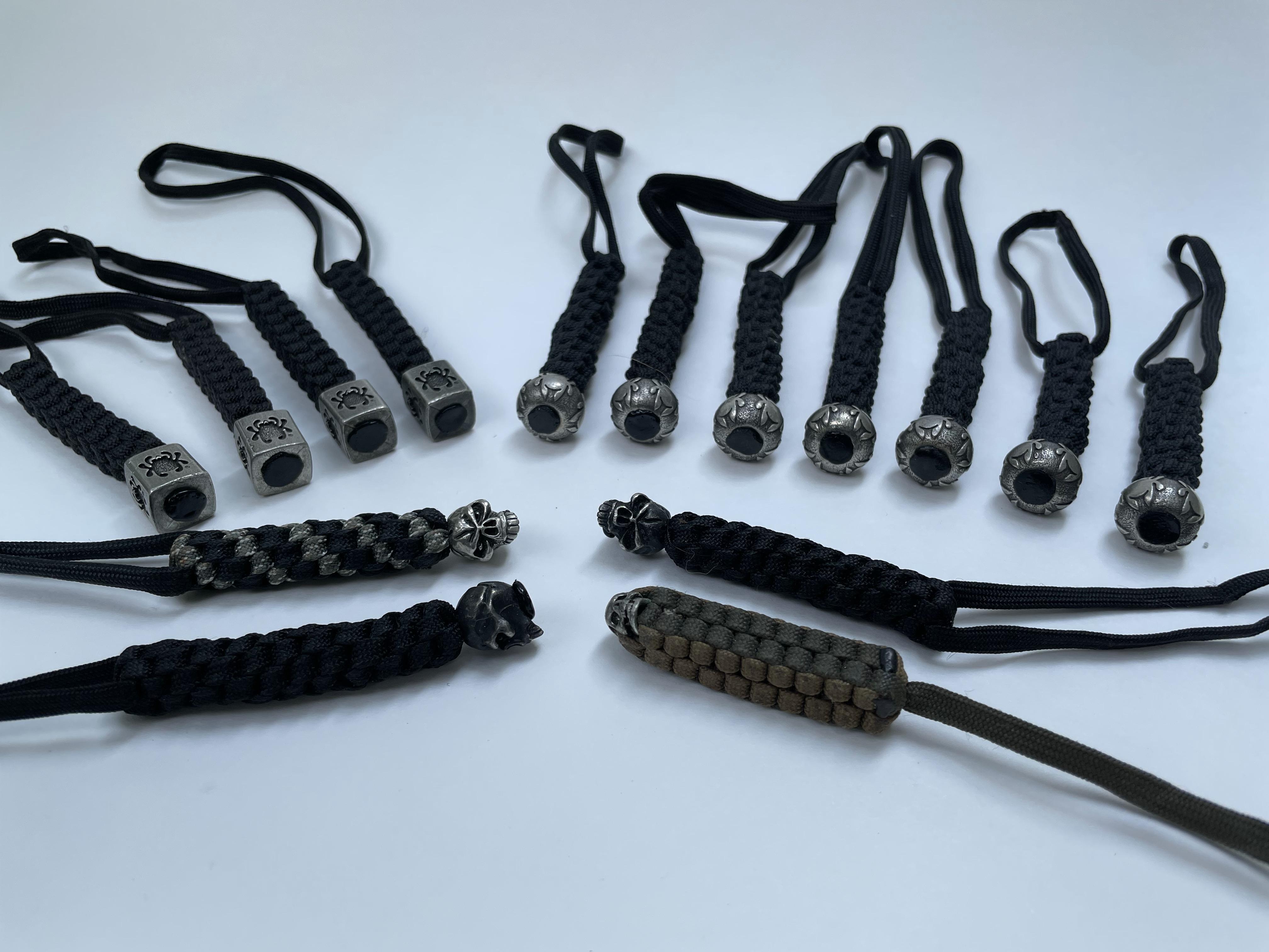 For sale are 7 Spyderco round pewter beads/lanyards and 4 Spyderco square pewter beads/lanyards. Selling as full lot. I will throw in the 4 punisher beads/lanyards (three of the four punishers are stamped with "© 2006" on the back of the skull and they might be Schmuckatelli Emerson beads but I am not an expert and am not claiming they are).
