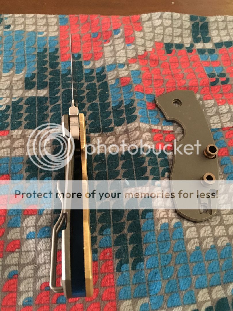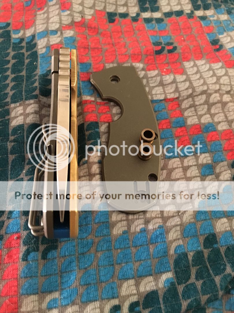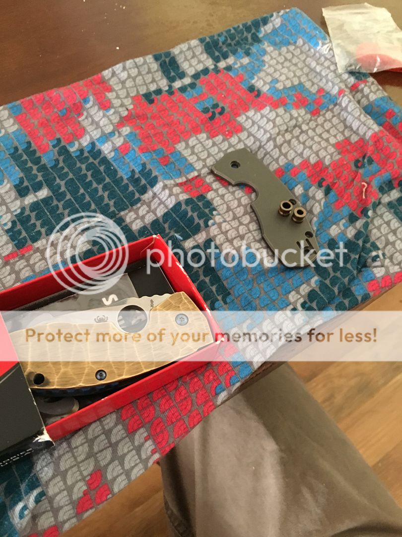 Spyderco Techno with Custom Brass Scale. It is a catch and release. Custom scale and hardware done by Dlaw Customs. The knife comes with custom bronze anodized Ti standoffs that can replace the blue backspacer and blue anodized Ti Hardware screws. All original screws and scale are included in the sale. There is a bit of lock stick and I don't have the time to troubleshoot or analyze. It is a steal with the type of customization included.
