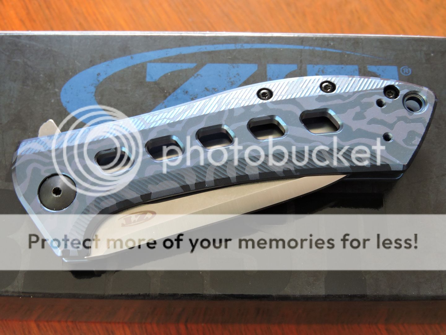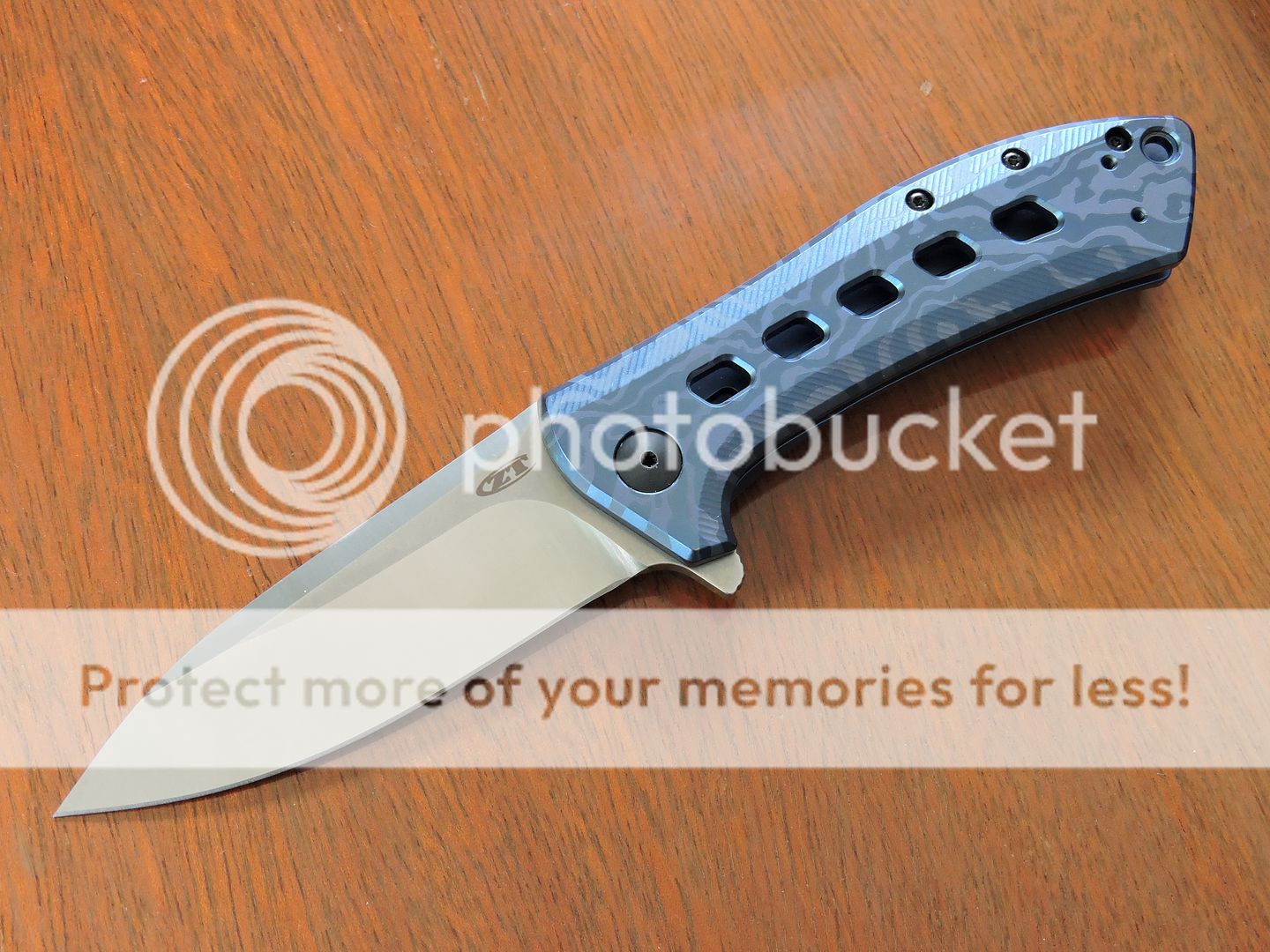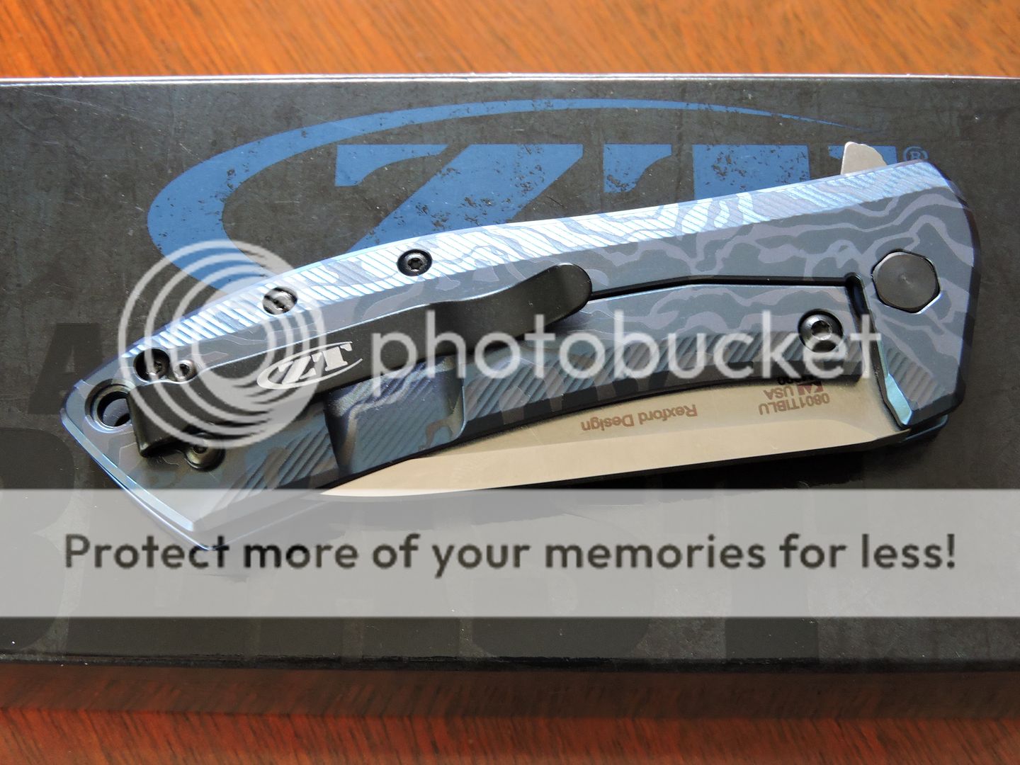 ZT 0801TiBlu is Sold. Its really a beautiful knife. Hard to capture the colors. In some light its a brilliant blue, and then in other light it shows a purple hue. Dead center blade. Fantastic flipping action.