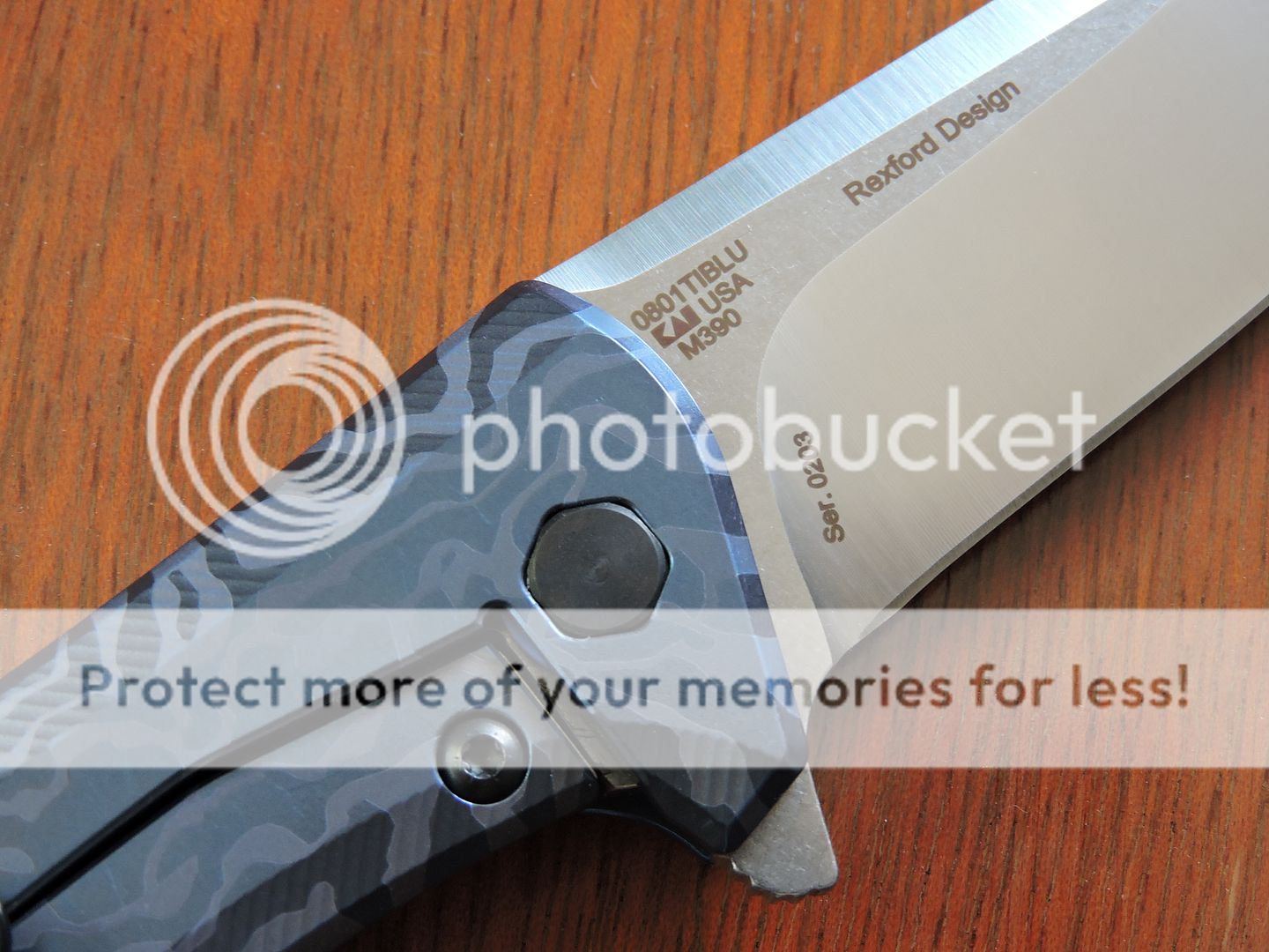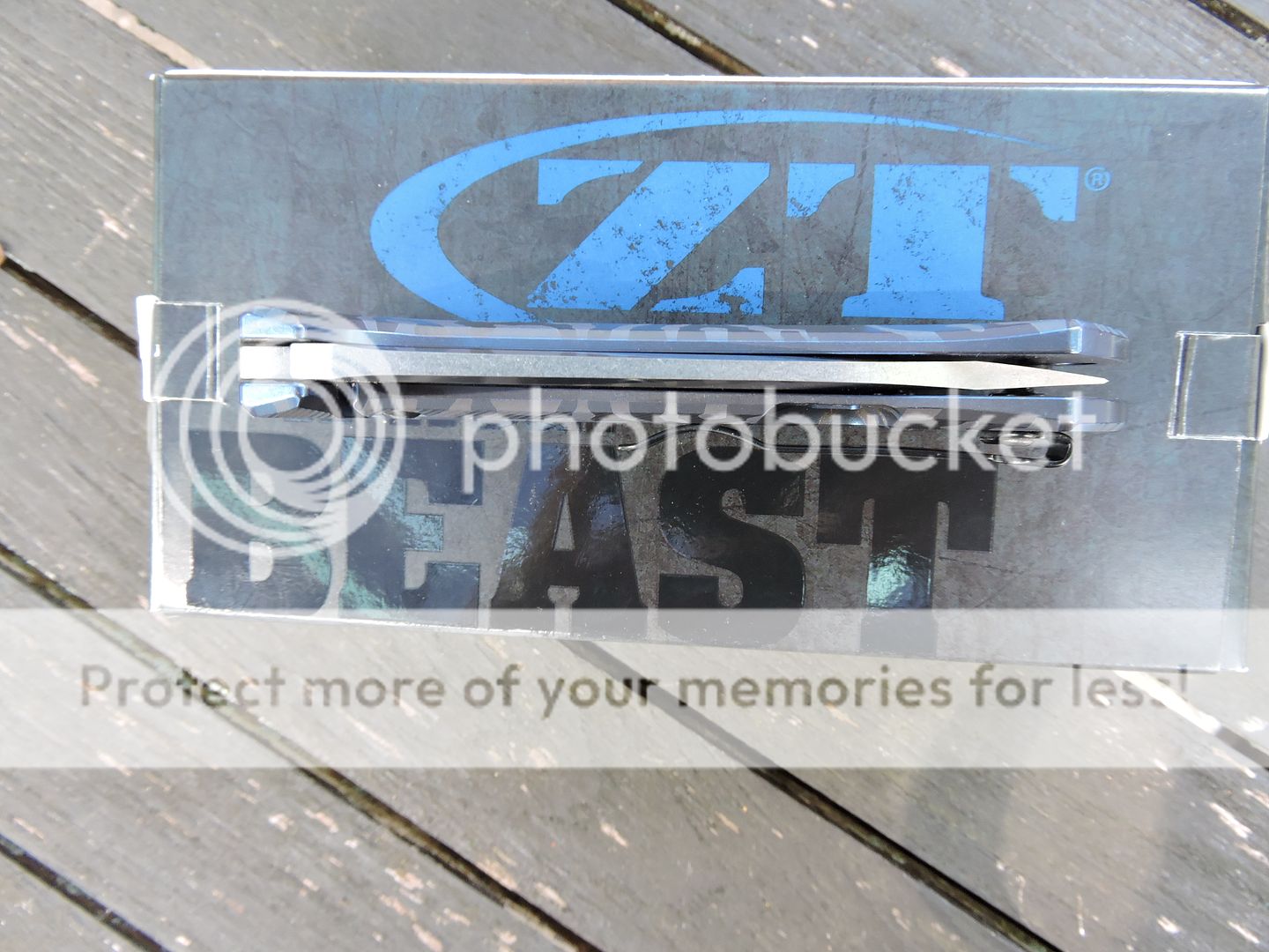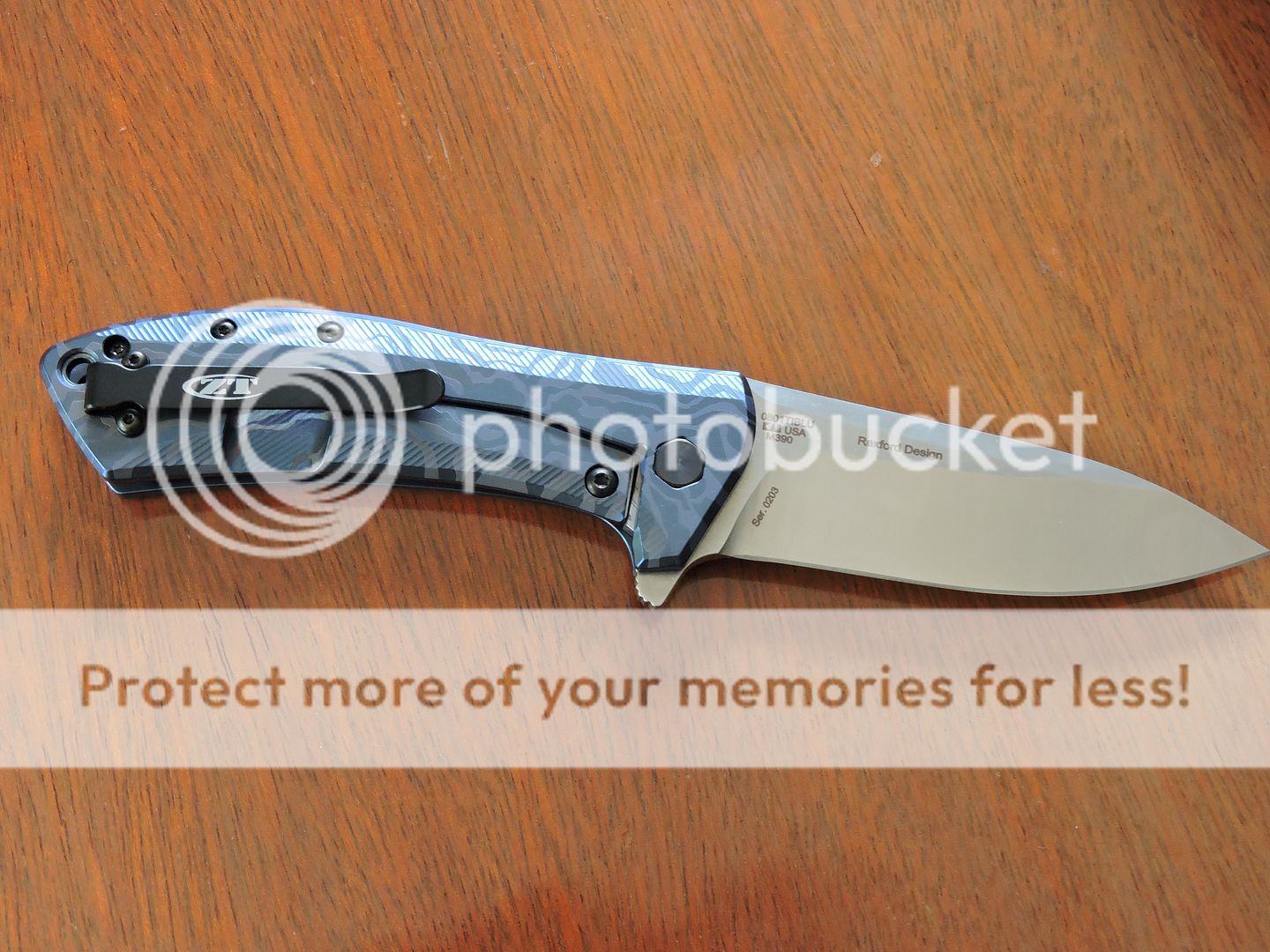 ZT 0801TiBlu is Sold. Its really a beautiful knife. Hard to capture the colors. In some light its a brilliant blue, and then in other light it shows a purple hue. Dead center blade. Fantastic flipping action.