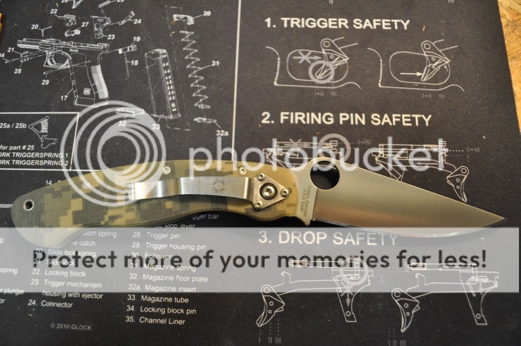 Next is a Spyderco Para 2 digital camo scale and DLC blade. Has been carried and sharpened to the same level as the Military. Has small damage to the scale where the knife got pulled out of my pocket that is shown in the picture.