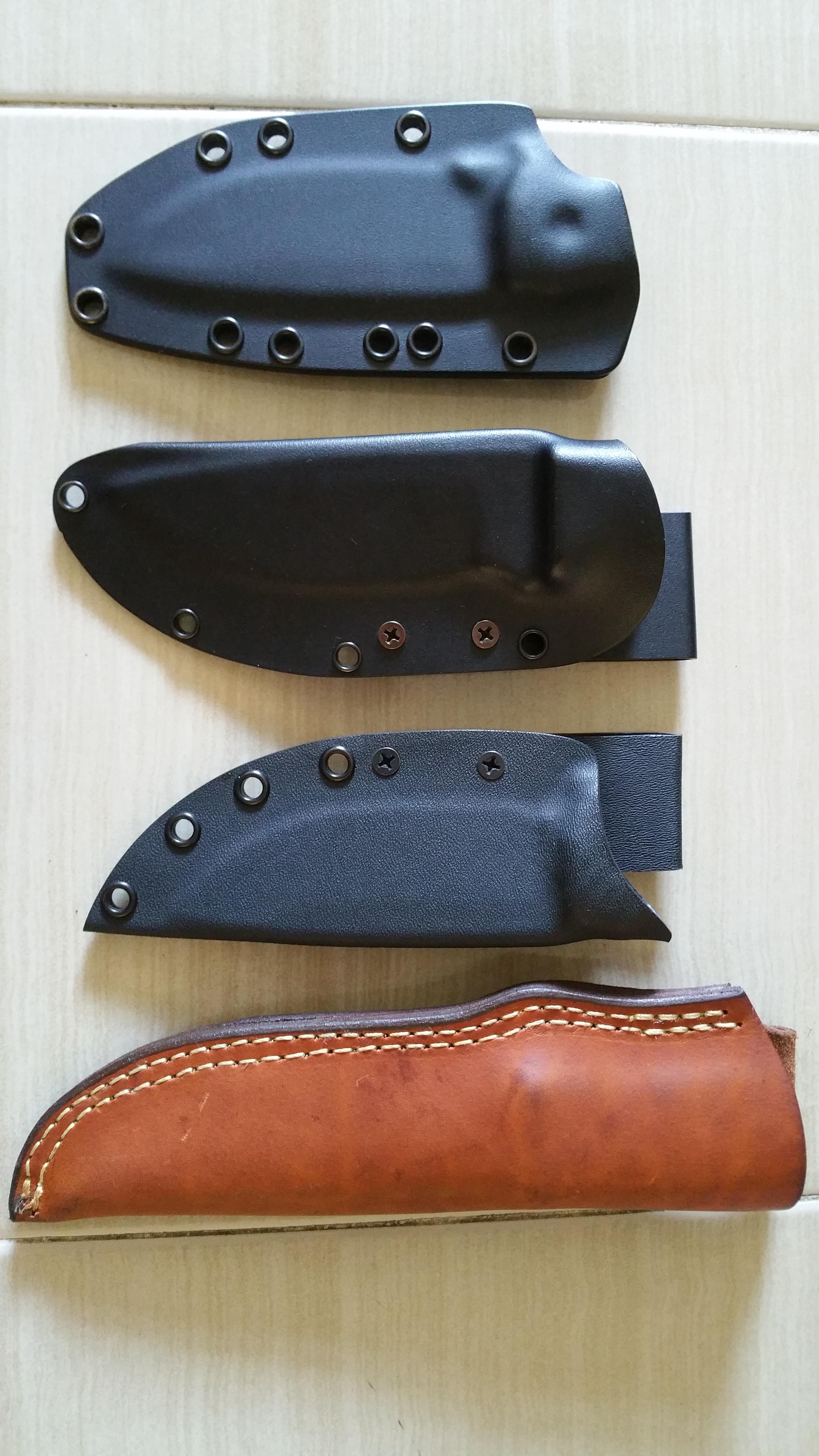 Original Gen 1 Howler, comes with original Swamp Rat leather sheath, NWA(Nick Allen) Re-grind, makes it a much better slicer IMO.. Never used or carried. Comes with the bottom 3 sheaths in the 2nd pic(top sheath is for a HRLM) $SOLD