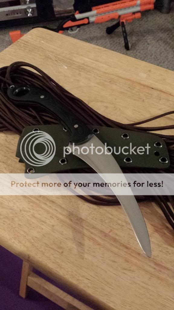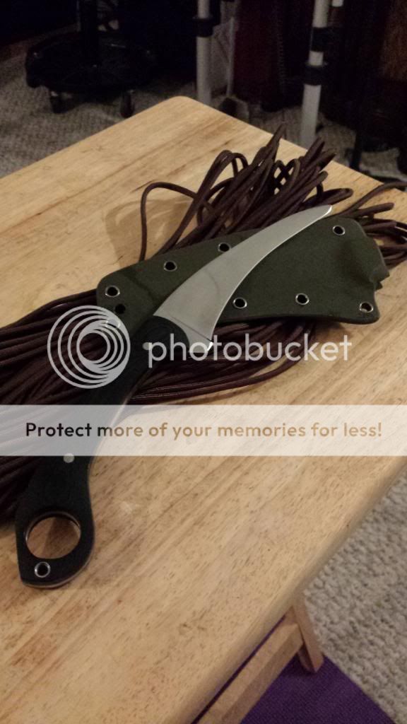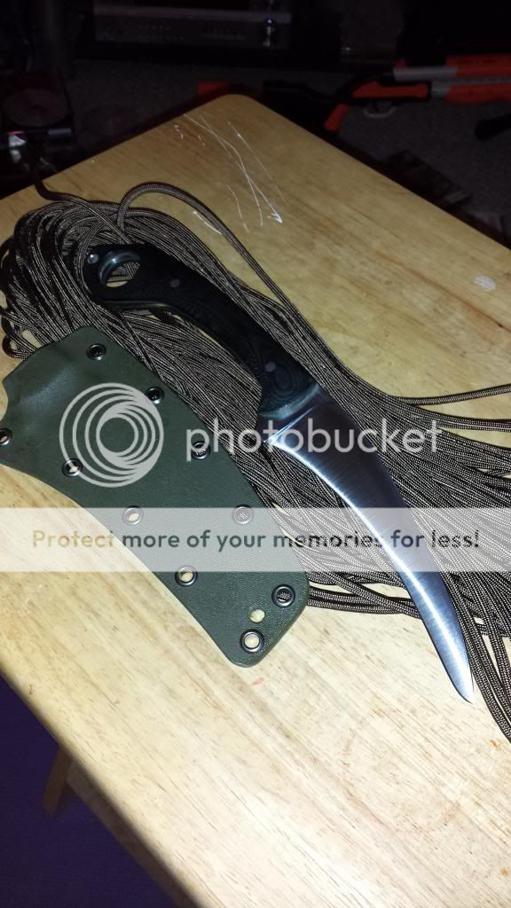 Today I will be selling my Karambit. Its made from n690 steel and heat treated to 59-60 HRC I might not have a huge curve like most karambit but I wanted to put my spin on it. It also doesn't have a super pointy tip so it wont break as easily. Made it a little rounded like a drop point. The sheath is made from OD Green kydex and has the best fit I have ever made. The rivet holes are made for large tek loc's. I polished the handles because I really like the look and feel of it, Looks like Carbon fiber a little. I made the grind a mirror polish and used a scotch brite belt to give it nice clean grind lines. The spin is left at a mirror polish for contrast and looks. Also the grind is a slight convex grind, ground to a zero grind with a small bevel. Any more info just email me at srgknives@gmail.com I can have this out in the mail tomorrow.