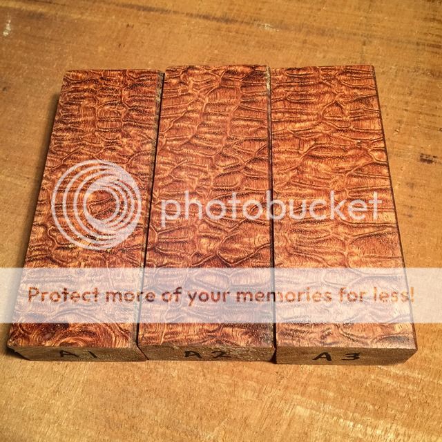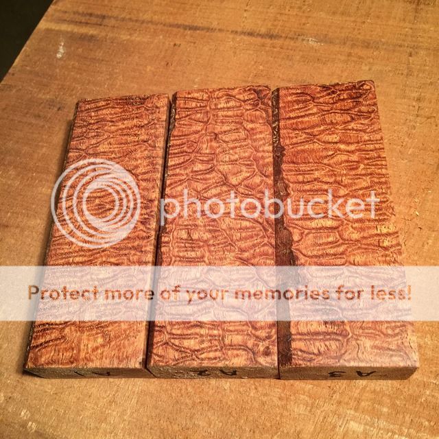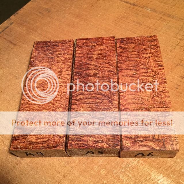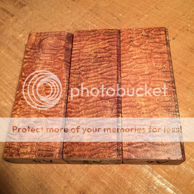 These were cut from the edge of a board that appears to have been milled with hand tools. The thickness was inconsistent and the edges were beveled. This part of the board had the best figure. Stabilized by K&G. Check, postal money order or paypal to dbflicker@att.net Add $6/order for a domestic flat rate box, international at actual cost.