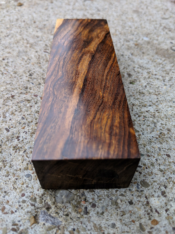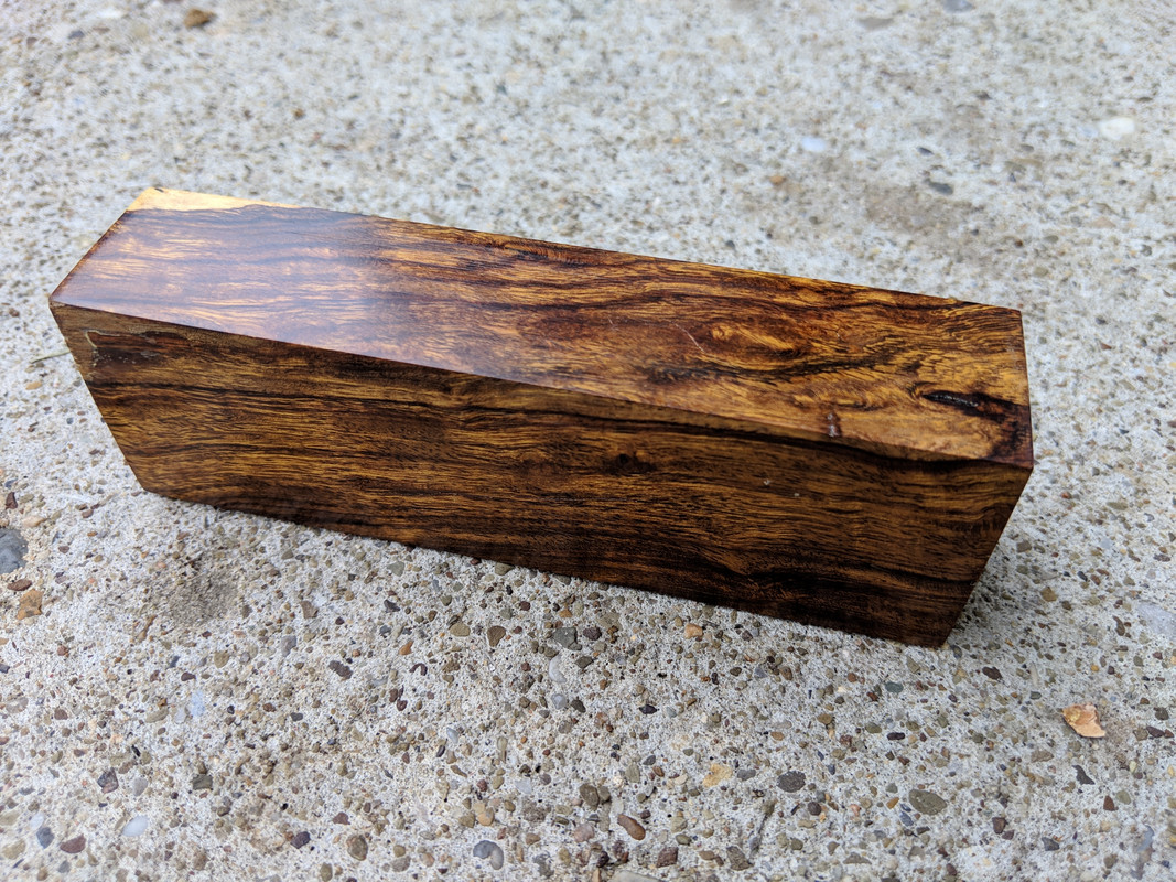 The Ironwood block is 5 1/4" x 1 11/16" x 1 1/8" (LxWxH) and is taken to a polish on all 4 sides. Why? I dunno. There is a touch of sapwood on one corner, but assuming the block is ripped to book-match, it shouldn't matter.