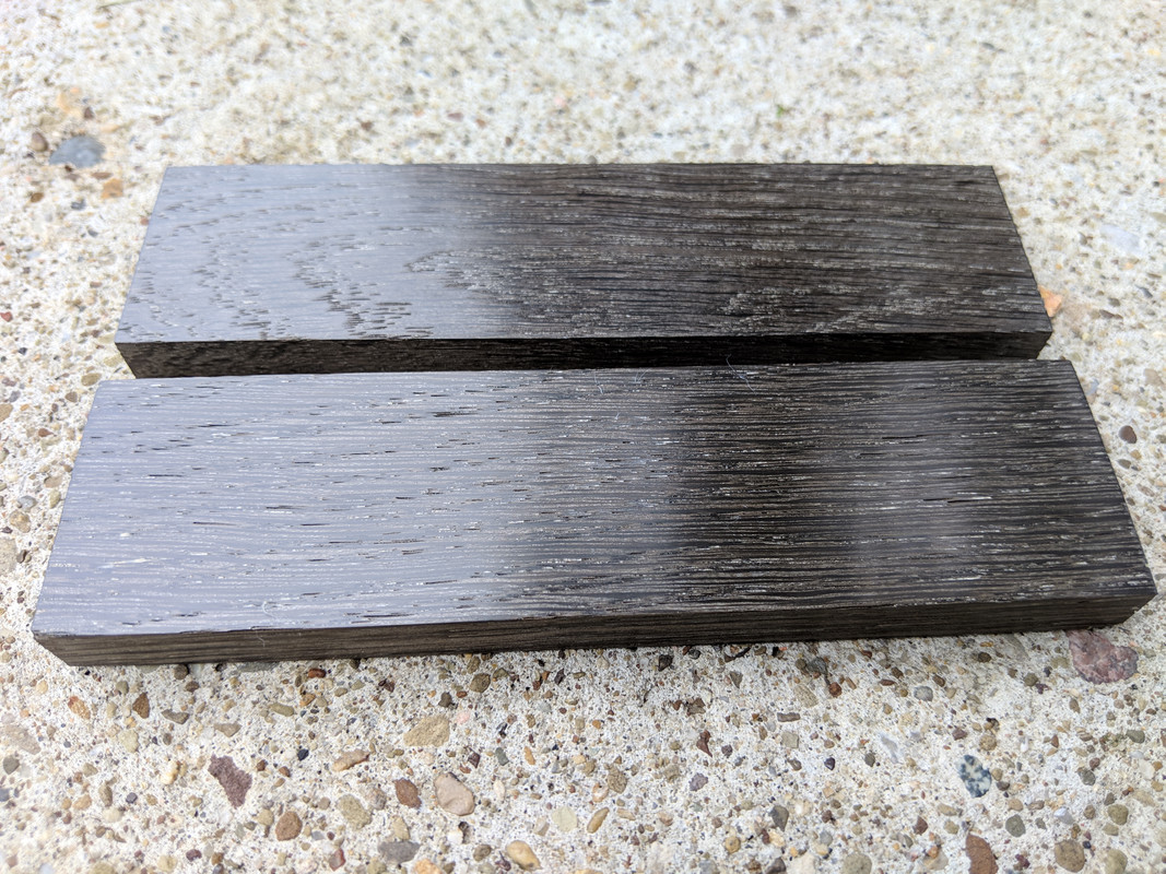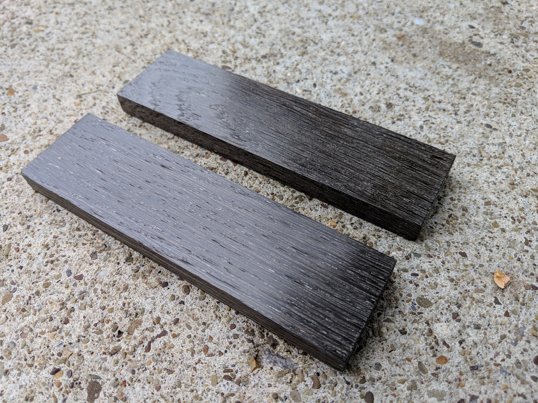 The Bog Oak came to me in random pieces, so these are NOT BOOK-MATCHED. However, I did pick two pieces that are very similar in grain. Each piece is 5 3/8" x 1 7/16" x 3/8" (LxWxH). Only the two faces were taken to a polish, the opposing sides were sanded to 800 and are ready for glue-up.