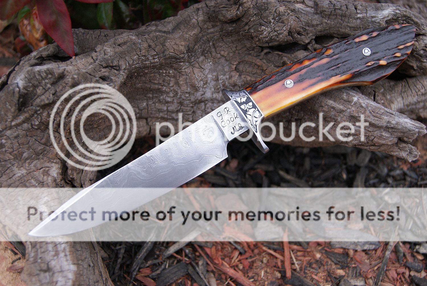 So how about sharing some pics for us all to enjoy? It can be a knife you made, a knife you own or just a knife you admire. So long as the handle is stag and the blade is damascus, post it up please!