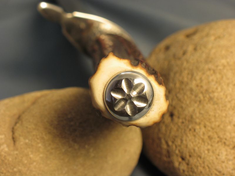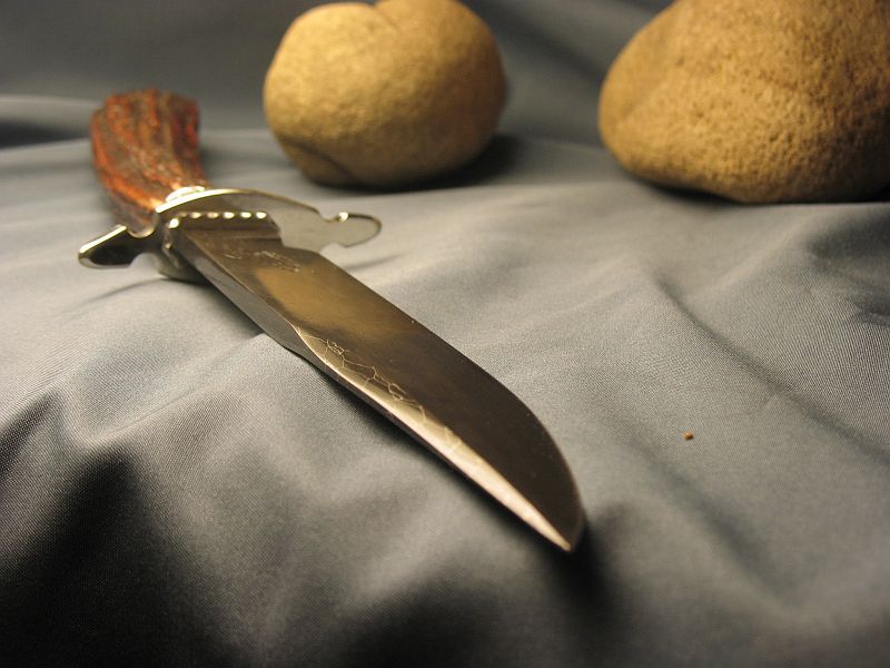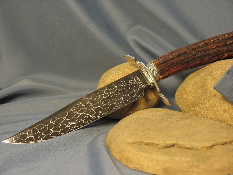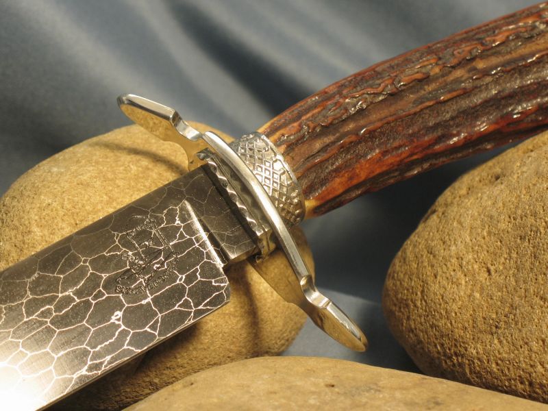 Hello folks. This is Sambar stag from India. Good for the right or left hand and very comfortable and is presentation grade. Great amber color. Hope you like it and here are the specs. Fittings are nickel silver and butt cap is carved while guard is file worked. Damascus I forged out of nickel plated smaller ball bearings which are 52100 steel to produce the pattern (Sharp and great edge retention). The blade measures 11 1/8 inches and overall is 9 inches. Is 3/16" thick at guard and taper to tip. sheath included. It is "SOLD" and priority mail is 8.00 USA. My paypal and e-mail is dangraves4923@earthlink.net