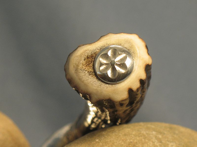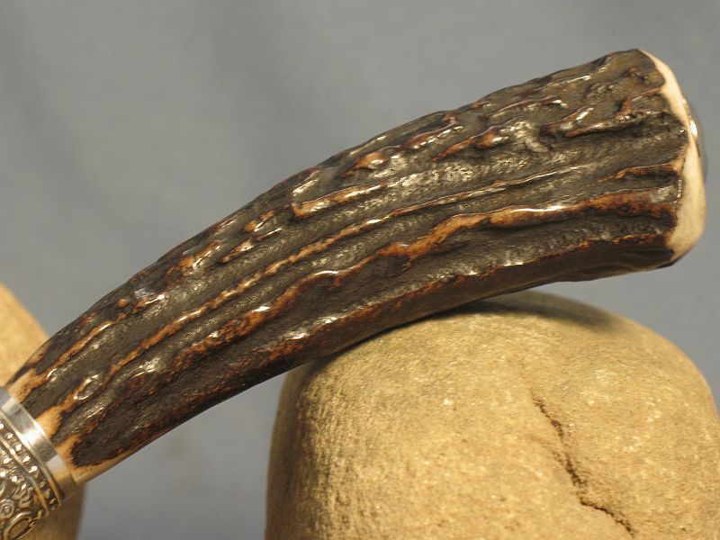Hello folks. This is Sambar stag from India. Good for the right or left hand and very comfortable. Hope you like it and here are the specs. Fittings are nickel silver and butt cap is carved while guard is file worked and ferrule is sterling silver. Damascus I forged of 4800KC and 52100 to produce the pattern (Sharp and great edge retention). The blade measures 3 1/2 inches and overall is 7 3/4 inches. Is 3/16" thick at guard and taper to tip. sheath included. It is "SOLD SOLD" and priority mail in USA is 6.00. My paypal and e-mail is dangraves4923@earthlink.net