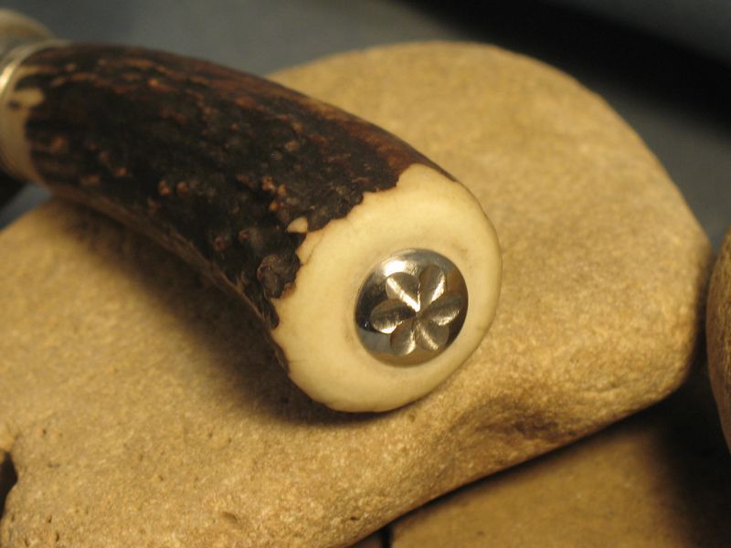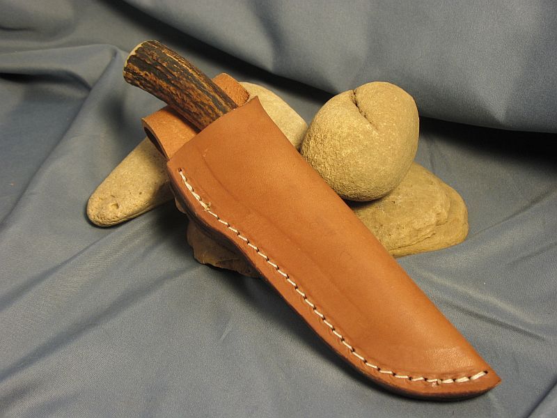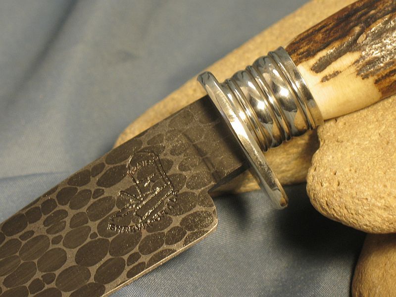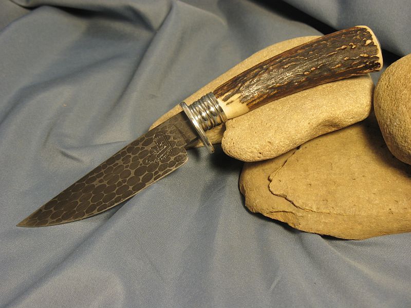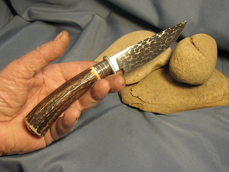 Hello folks. This is Sambar stag from India. Good for the right or left hand and very comfortable. Hope you like it and here are the specs. Fittings are nickel silver and butt cap is carved. Damascus I forged of 4800KC and 52100 to produce the pattern (Sharp and great edge retention). The blade measures 4 1/8 inches and overall is 8 1/4 inches. Is .200" thick at guard and taper to tip. sheath included. It is "SOLD" and priority mail in USA is 6.00. My paypal and e-mail is dangraves4923@earthlink.net