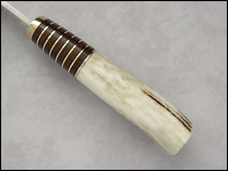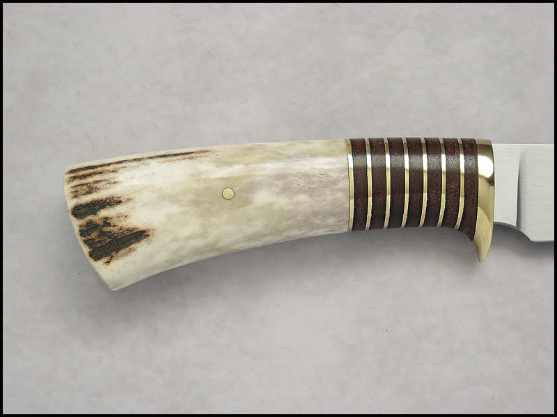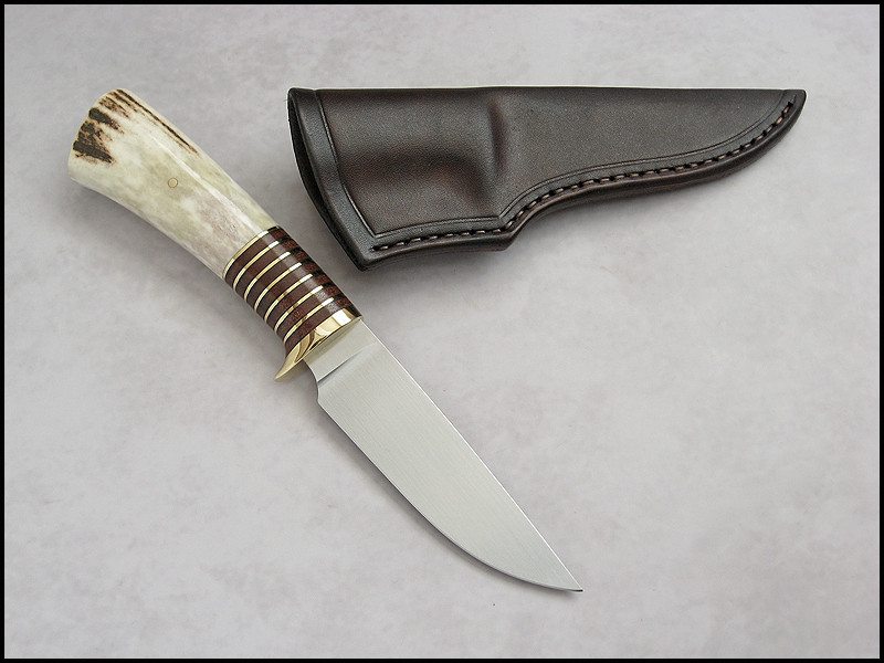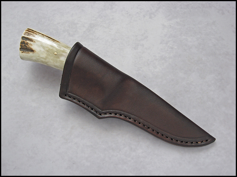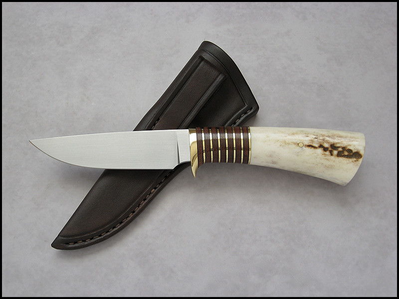 Stag Hunter for sale. steel D2 / 3.4 mm [134"] length 239 mm [9.409"] blade 115 mm [4.055"] handle - brass, leather, stag sheath - leather Price - 333 USD SOLD Included International Priority Mail