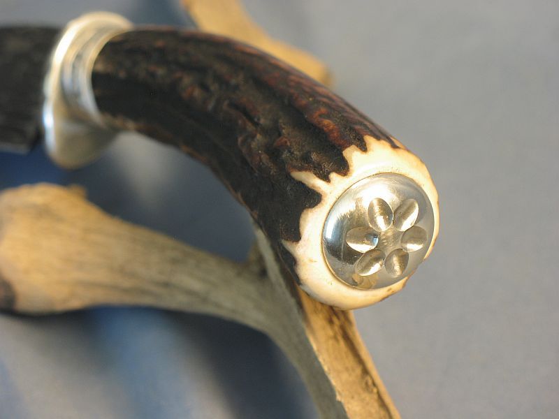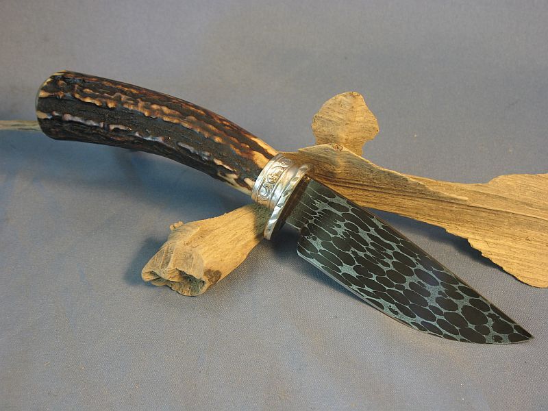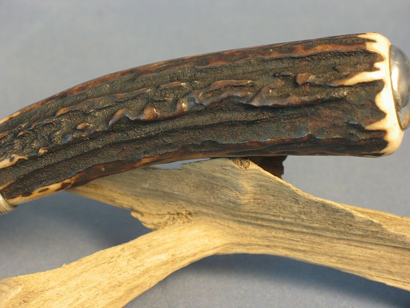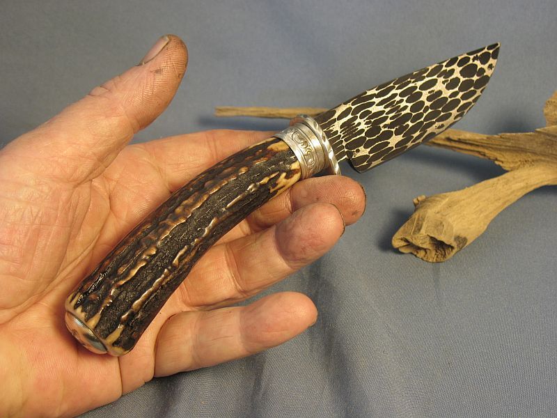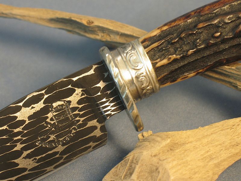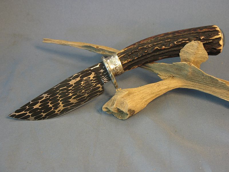 Hello folks. This is Sambar stag from India. Good for the right or left hand and very comfortable. Hope you like it and here are the specs. Fittings are nickel silver and butt cap is carved while guard is file worked. Damascus I forged of 4800KC and 52100 to produce the pattern (Sharp and great edge retention). It has a blade that measures 3 7/8 inches and overall is 8 1/8 inches. Is 1/4" thick at guard and taper to tip. sheath included. It is "SOLD" free priority mail in USA. My paypal is dangraves4923@earthlink.net