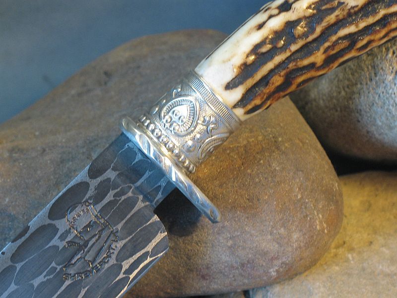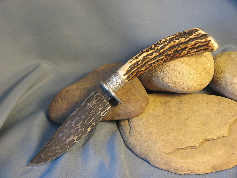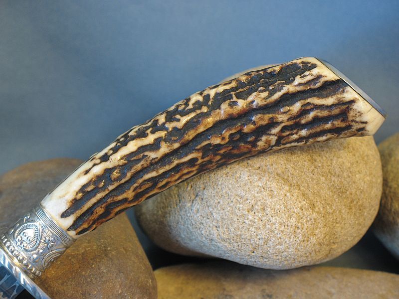 Hello folks. This is Sambar stag from India. Good for the right or left hand and very comfortable. Hope you like it and here are the specs. Fittings are nickel silver and the guard is file worked. Damascus I forged of 4800KC and 52100 to produce the pattern (Sharp and great edge retention). The blade measures 4 3/8 inches and overall is 9 1/16 inches. Is 3/16" thick at guard and taper to tip. sheath included. It is "SOLD" and priority mail in USA is 6.00. My paypal and e-mail is dangraves4923@earthlink.net