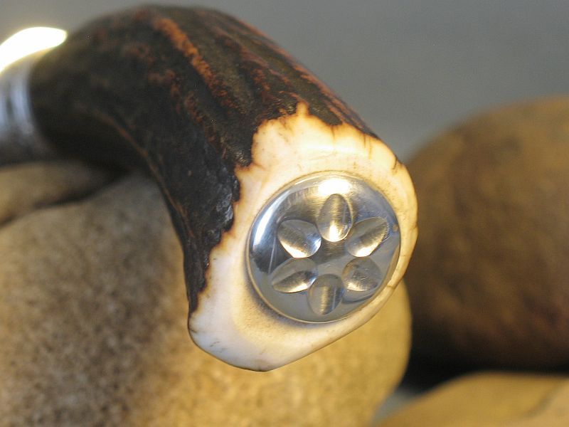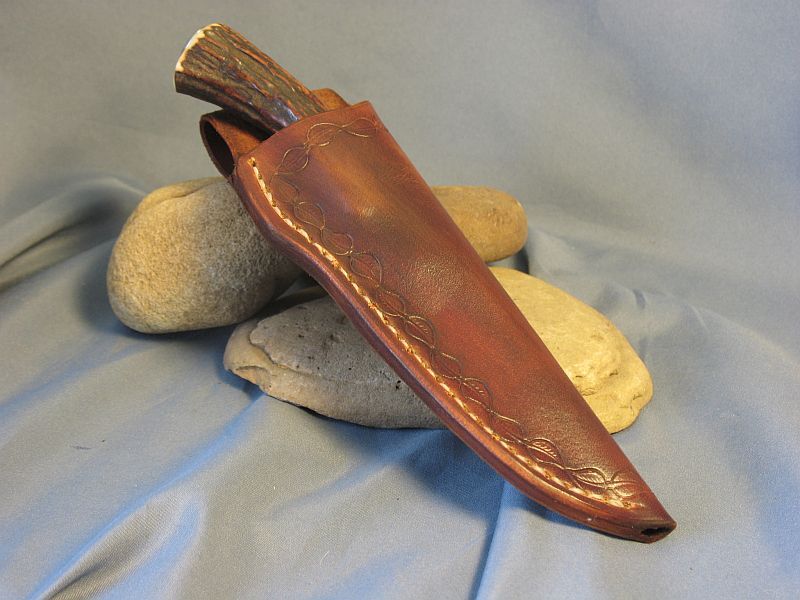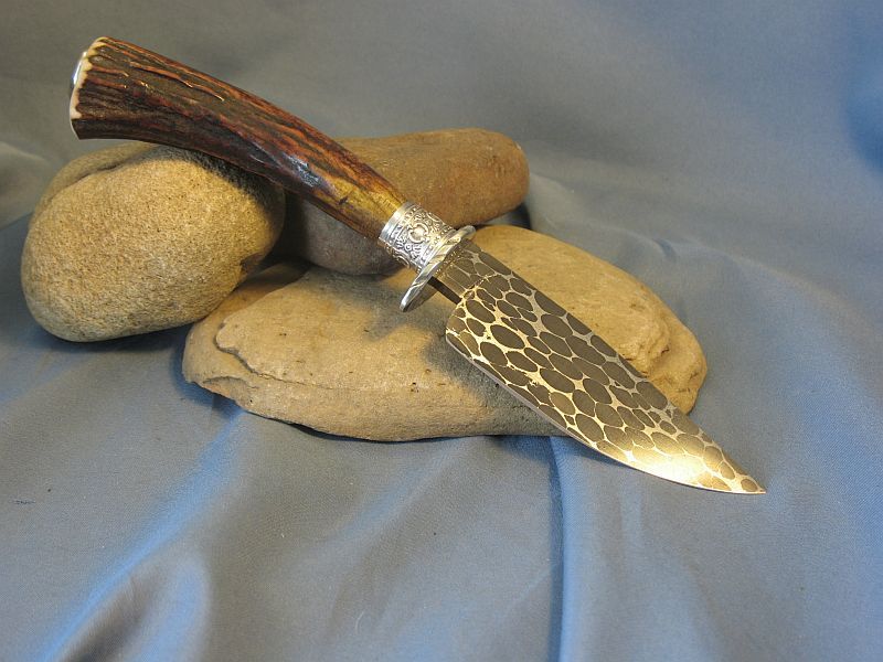 Hello folks. This is Sambar stag from India. Good for the right or left hand and very comfortable. Hope you like it and here are the specs. Fittings are nickel silver and the guard is file worked. Damascus I forged of 4800KC and 52100 to produce the pattern (Sharp and great edge retention). The blade measures 4 inches and overall is 8 1/2 inches. Is .214 thick at guard and taper to tip. sheath included. It is "SOLD" and priority mail in USA is 6.00. My paypal and e-mail is dangraves4923@earthlink.net