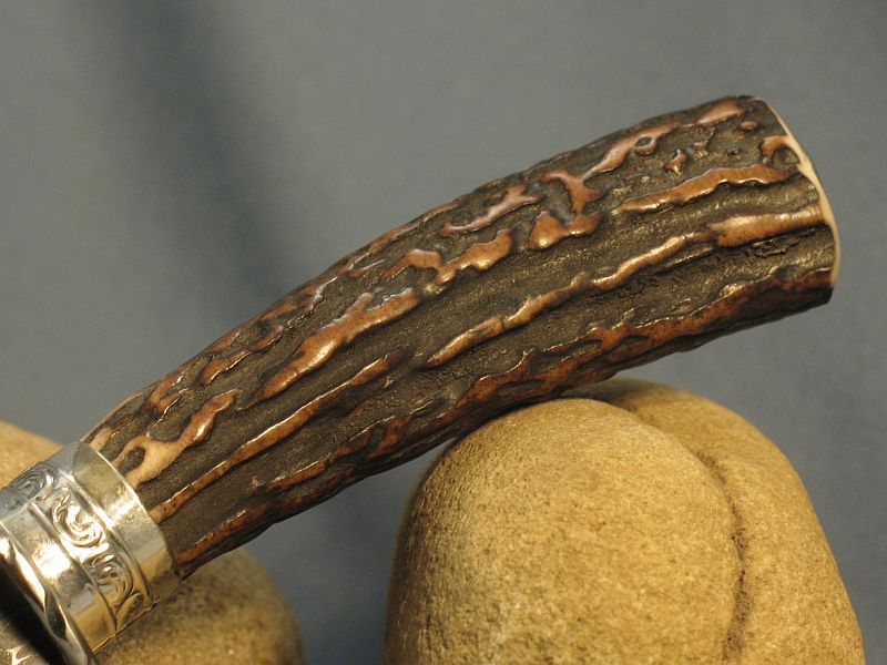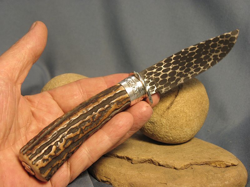 Hello folks. This is Sambar stag from India. Good for the right or left hand and very comfortable. Hope you like it and here are the specs. Fittings are nickel silver and butt cap is carved while guard is file worked. Damascus I forged of 4800KC and 52100 to produce the pattern (Sharp and great edge retention). The blade measures 3 1/2 inches and overall is 8 inches. Is 1/4" thick at guard and taper to tip. sheath included. It is "SOLD" and priority mail in USA is 6.00. My paypal and e-mail is dangraves4923@earthlink.net